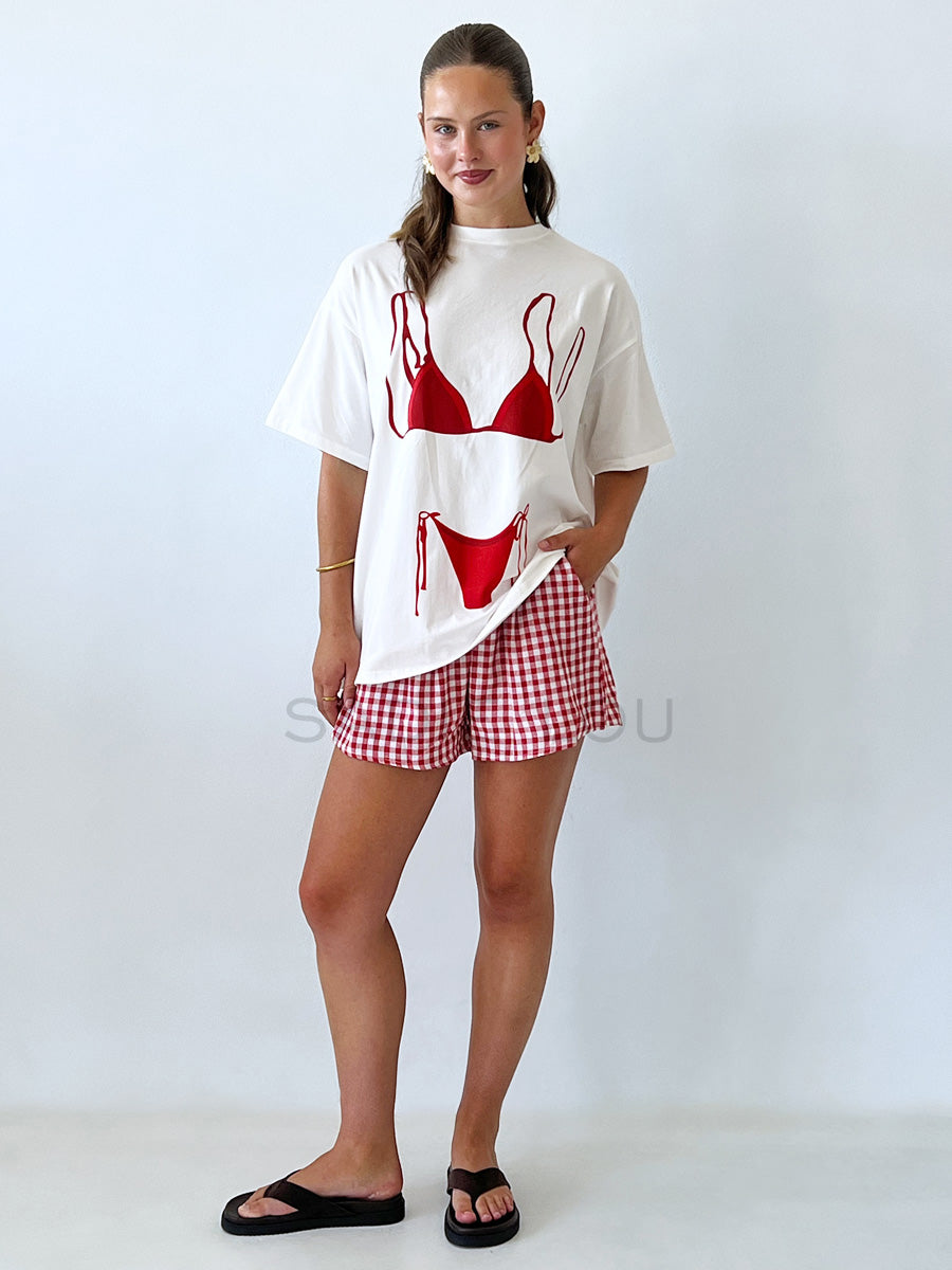 Set on a clean white base, the T-shirt features a striking red bikini graphic on the front, adding a cheeky, beach-inspired touch that instantly stands out. The vibrant print makes it an easy statement piece, perfect for pairing with denim, shorts, or layered looks.