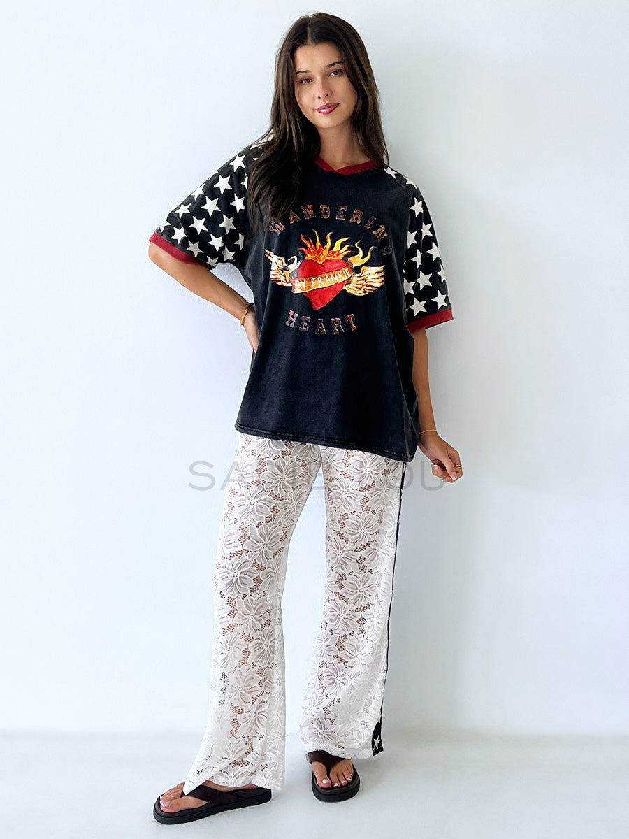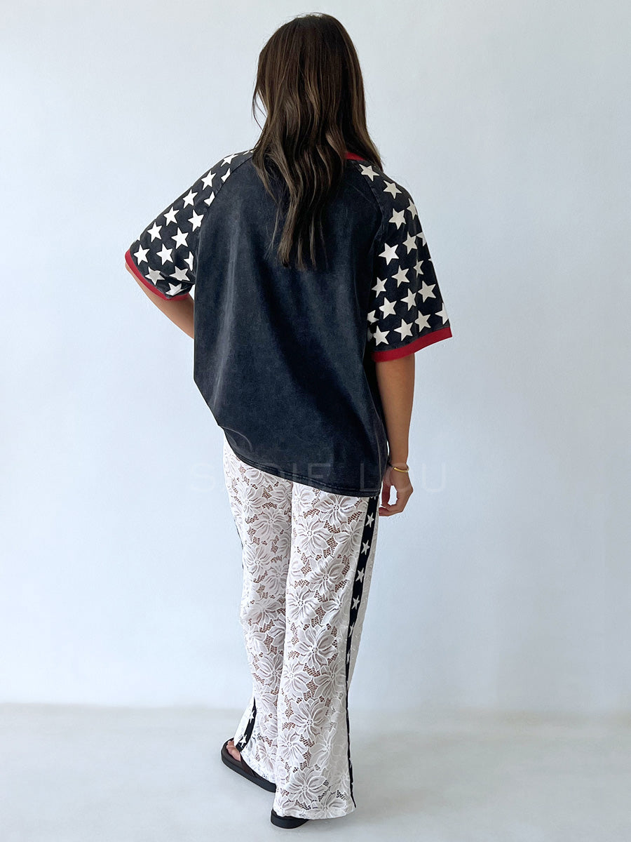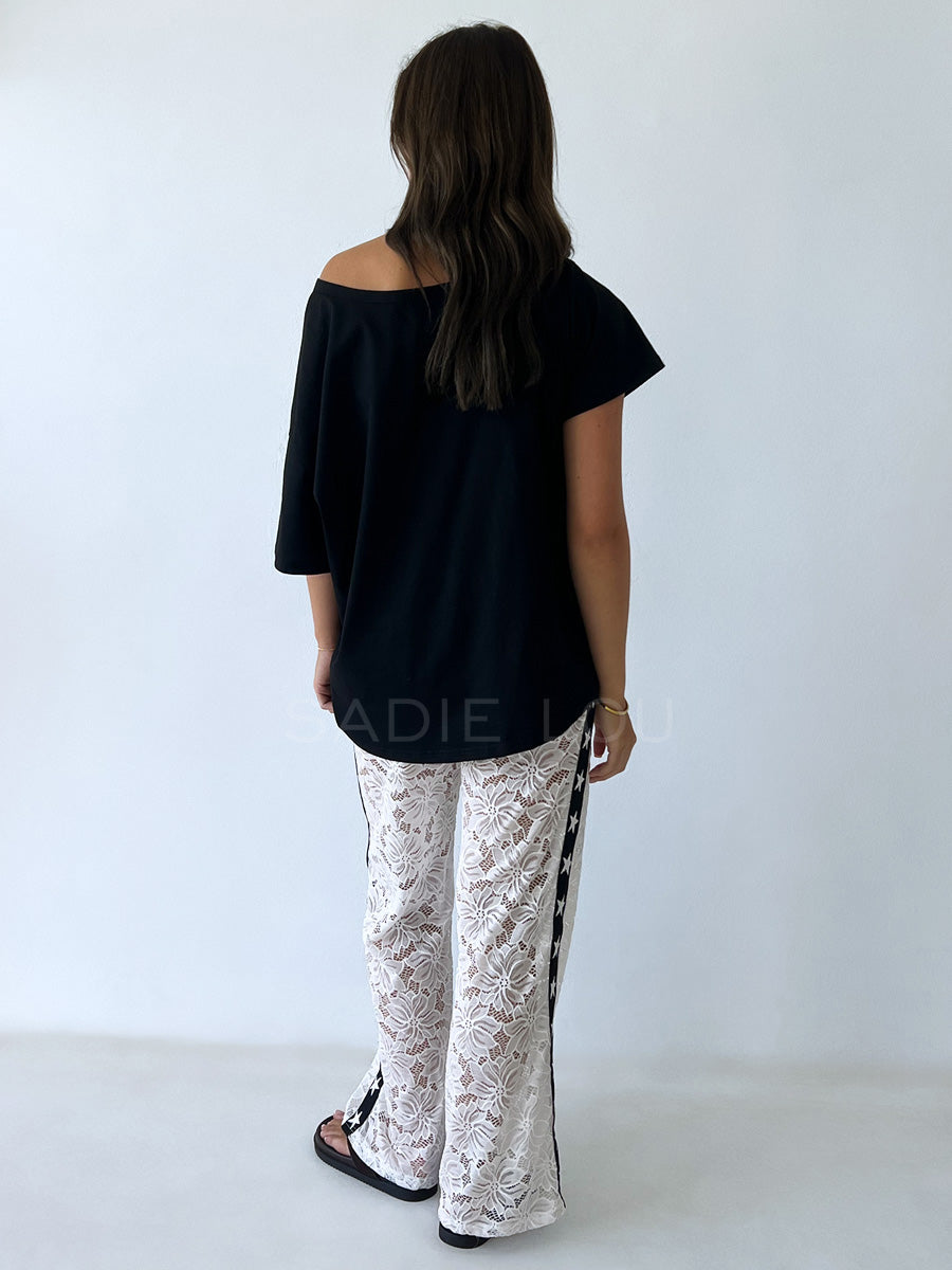 Each leg is accented with a Black side stripe adorned with White stars, creating a bold contrast against the delicate black lace. This striking visual difference makes the stripe and star detailing pop, blending feminine lace with a sporty-chic edge.