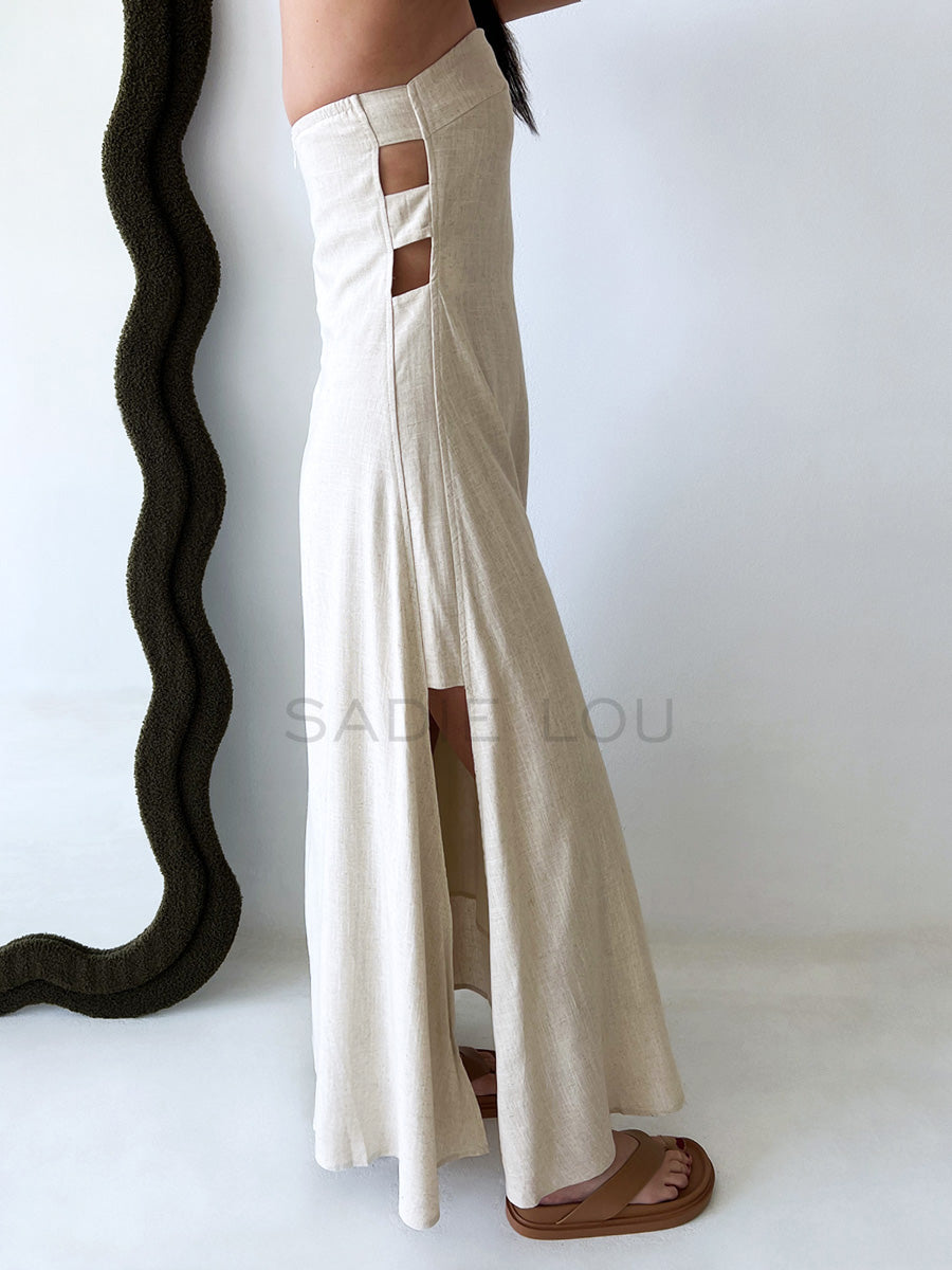 Falling to a full-length hem, the skirt flows naturally with every step, thanks to the lightweight linen-cotton blend that breathes beautifully in warmer weather. Whether paired with strappy sandals, woven slides, or layered with an oversized shirt for a laid-back look, this piece transitions seamlessly from day to night.