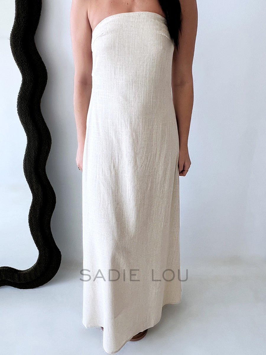 Where effortless meets elevated — this strapless maxi dress is made from a soft, breathable blend of 50% cotton and 50% linen, offering that perfect balance of structure and flow. Designed with sun-drenched days and warm nights in mind, it features a clean boob tube-style bodice that sits securely across the chest, giving a sleek and minimal silhouette.