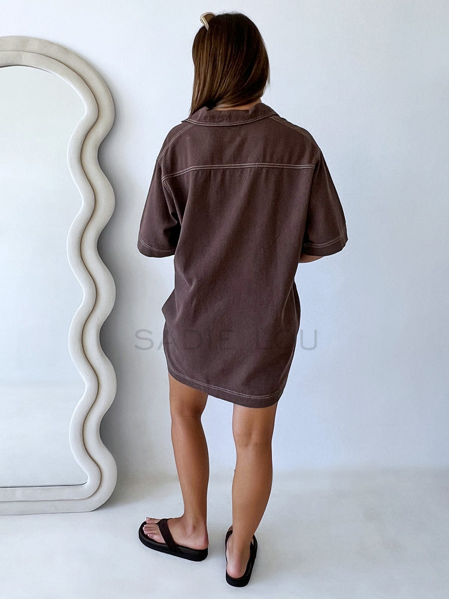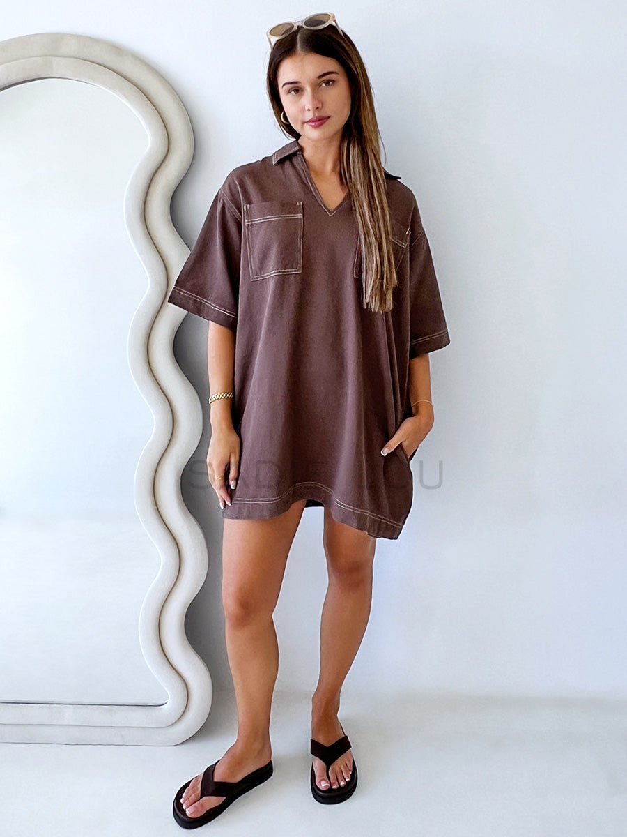 Designed with a structured collar and a modest, not-too-deep V neckline, it strikes the perfect balance between relaxed and refined. Two front chest pockets add a touch of utility-inspired detail, while the short sleeves keep the look easy and versatile. A contrasting hem detail finishes the dress with subtle dimension and added interest.