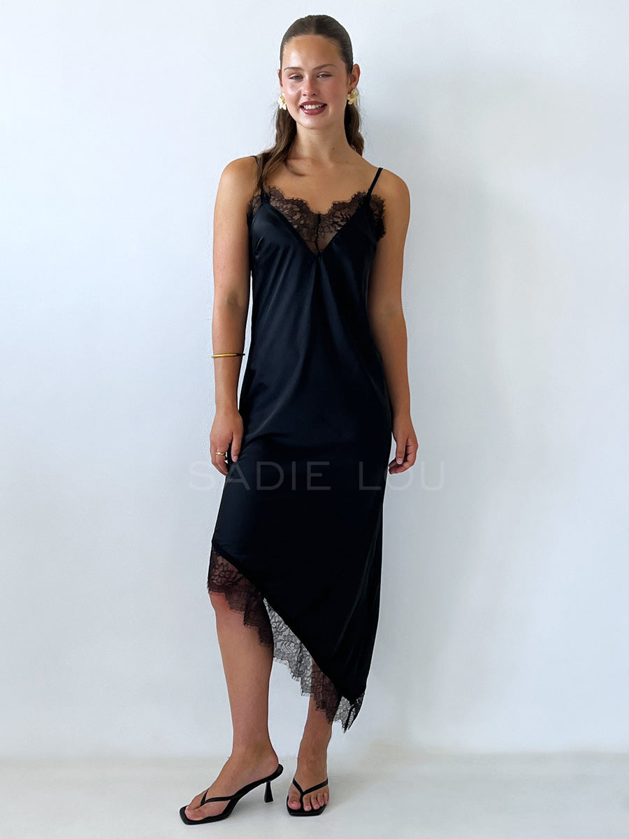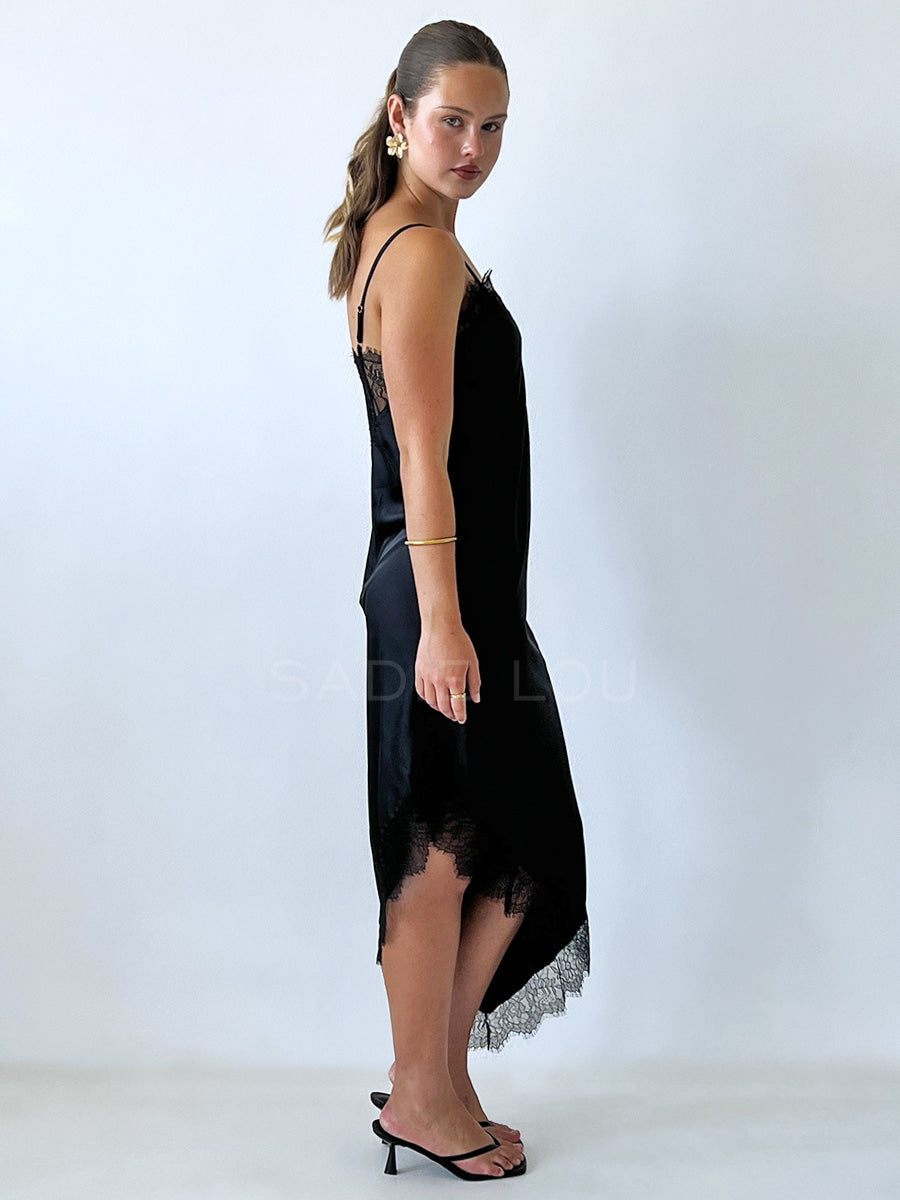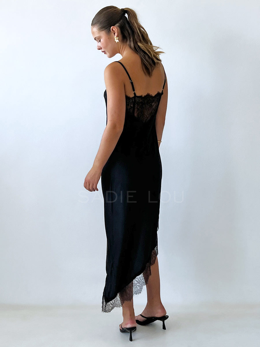 Elegant and effortlessly feminine, this midi slip dress features a flattering asymmetrical hem that adds movement and sophistication. Delicate lace trims accent the bust and the bottom hem, enhancing its romantic appeal. With adjustable spaghetti straps and a soft, stretchy fabric blend of 95% polyester and 5% elastane, it offers both comfort and a flattering fit.