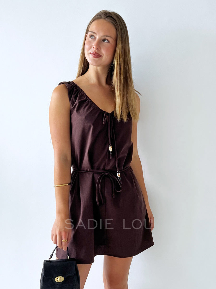 Simple, chic, and effortlessly wearable, this sleeveless mini dress is designed for warm days and easy styling. Made from 100% cotton, it offers a naturally soft and breathable feel with a smooth, lightweight finish. The dress features a flattering scoop neckline with subtle ruching and a delicate tie detail accented with wooden-style beads for a touch of natural texture.