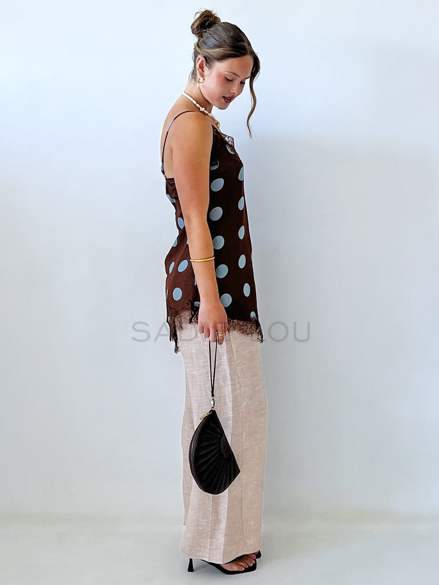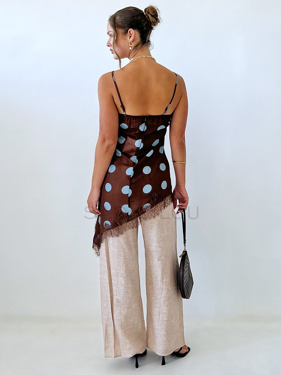 Feminine and playful, this asymmetrical spaghetti-strap top showcases a chocolate backdrop dotted with oversized blue polka dots. Lace detailing accents the bust and bottom hem, adding texture and charm.