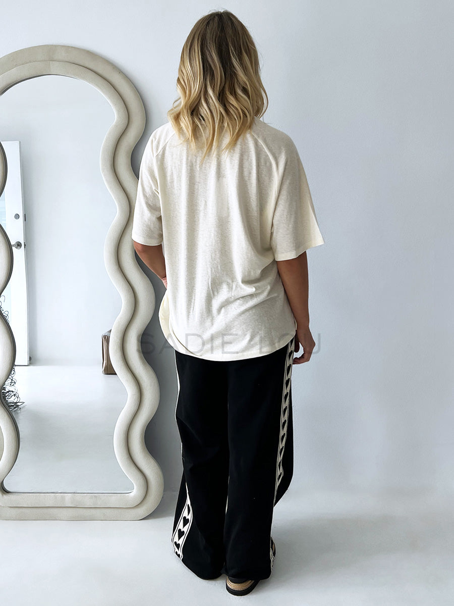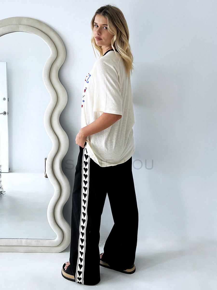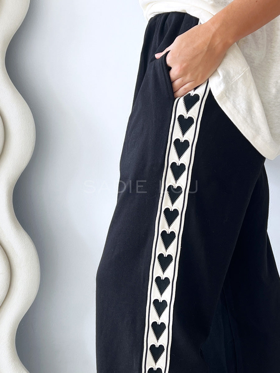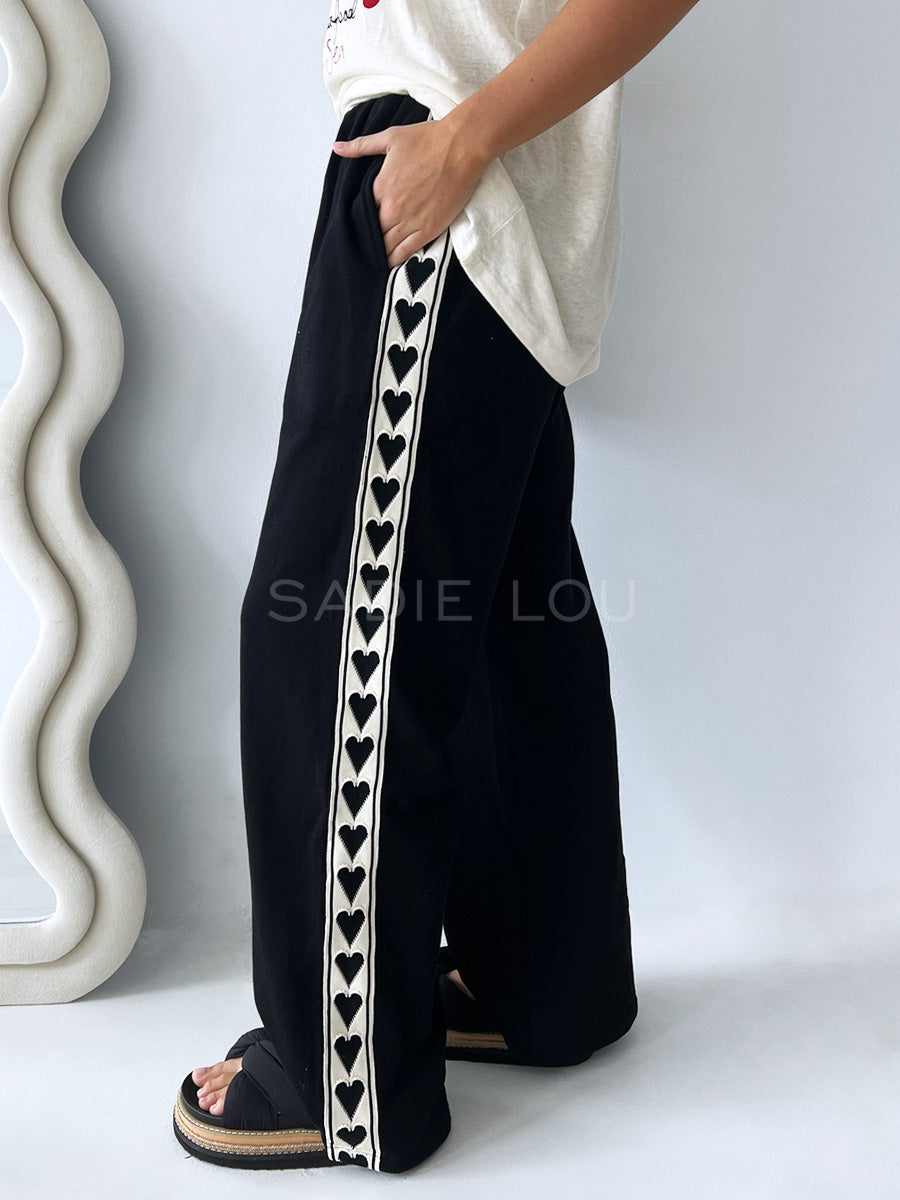 This lightweight track pant is made from a soft cotton jersey fabric. It has been designed with a relax fit and features contrast heart taping down each leg.