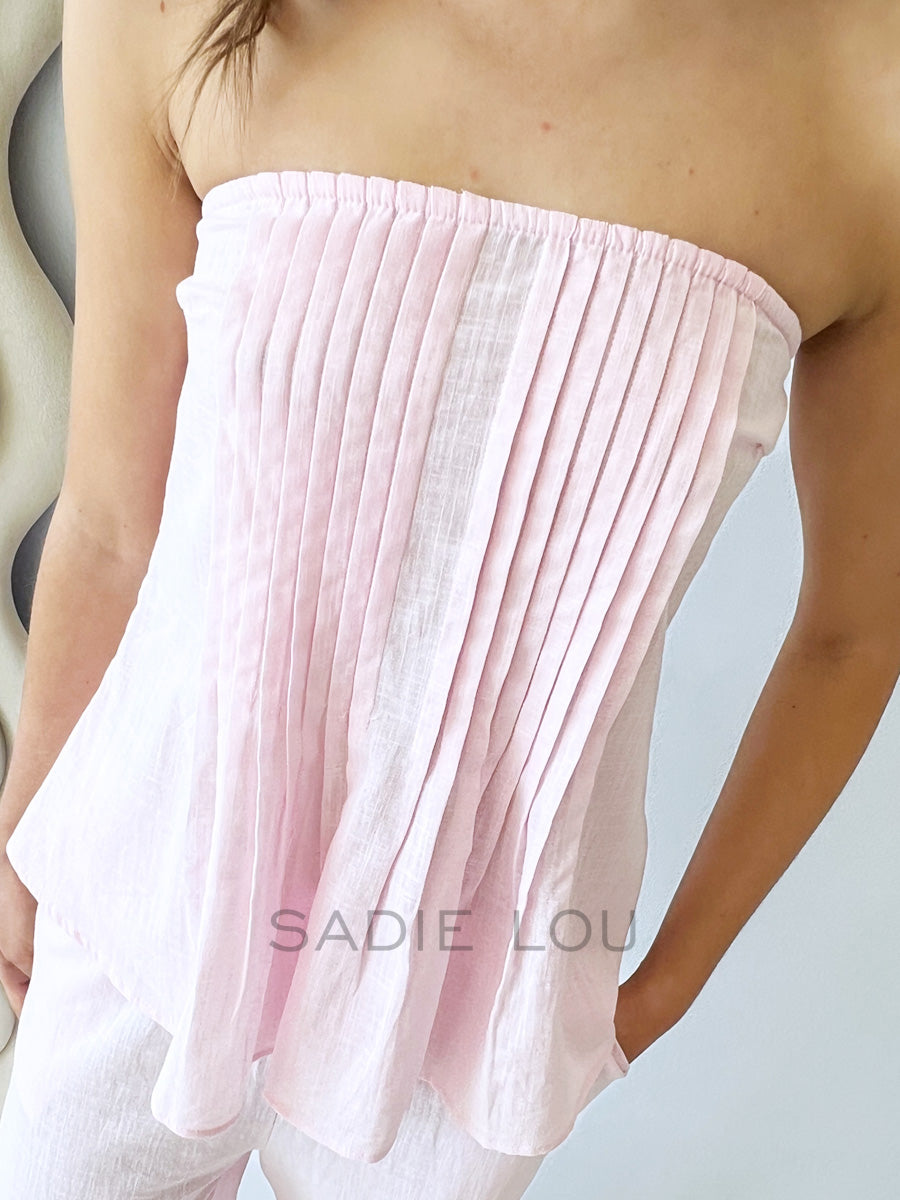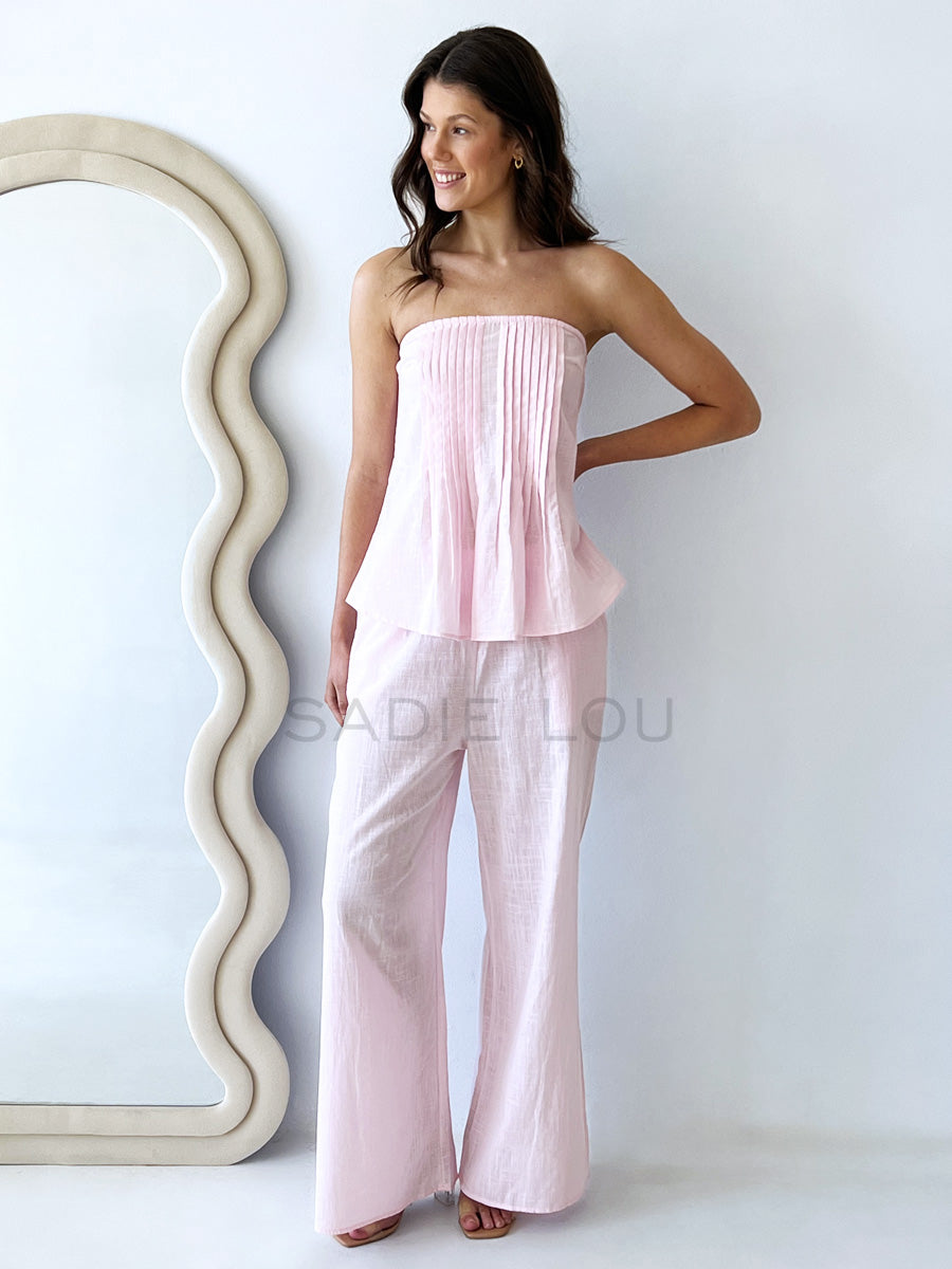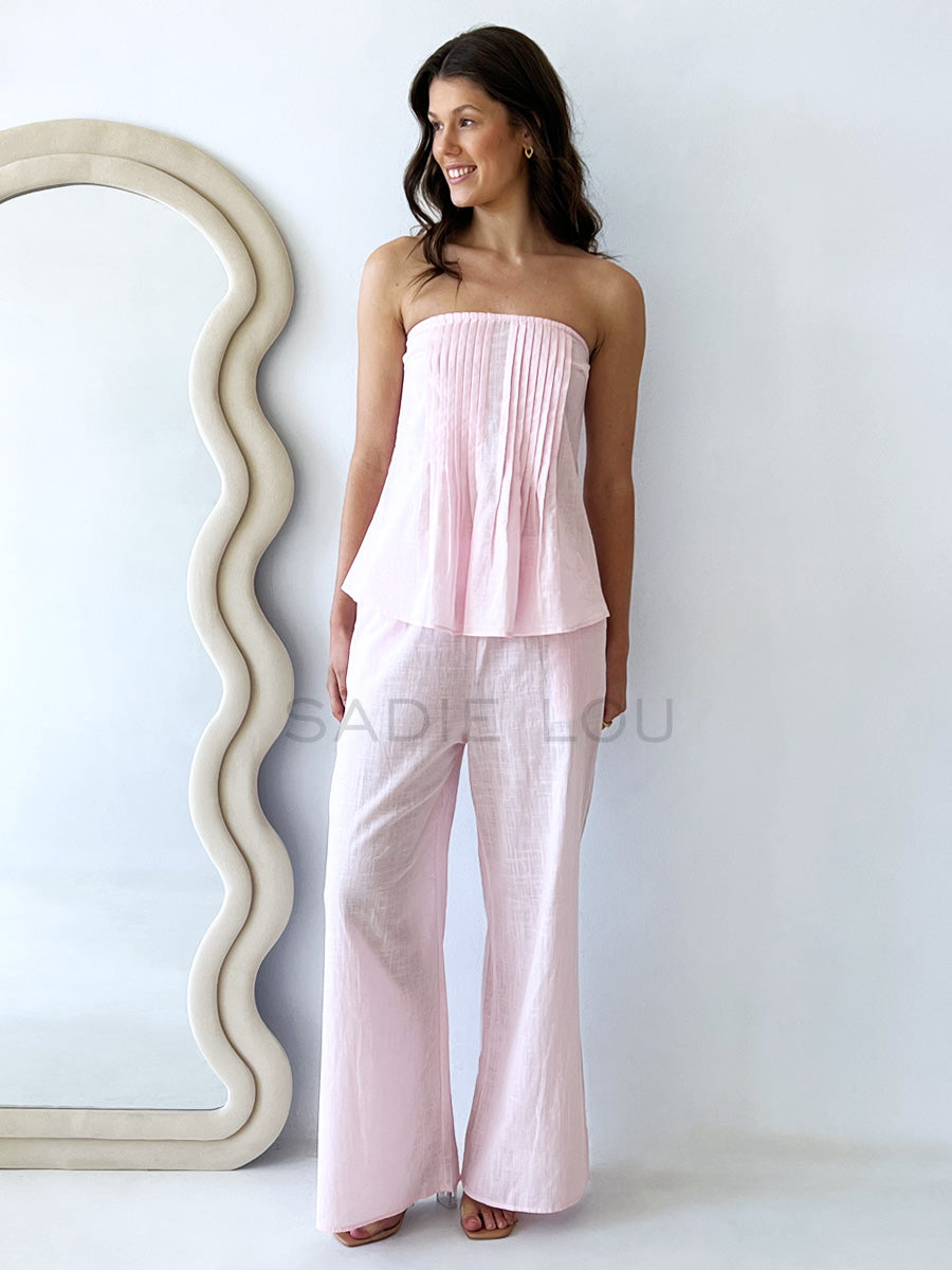 A strapless pleated top with a zip up side to give shape and flow with a matching full-length pant with an elasticated waist making this outfit comfortable and easy to wear.