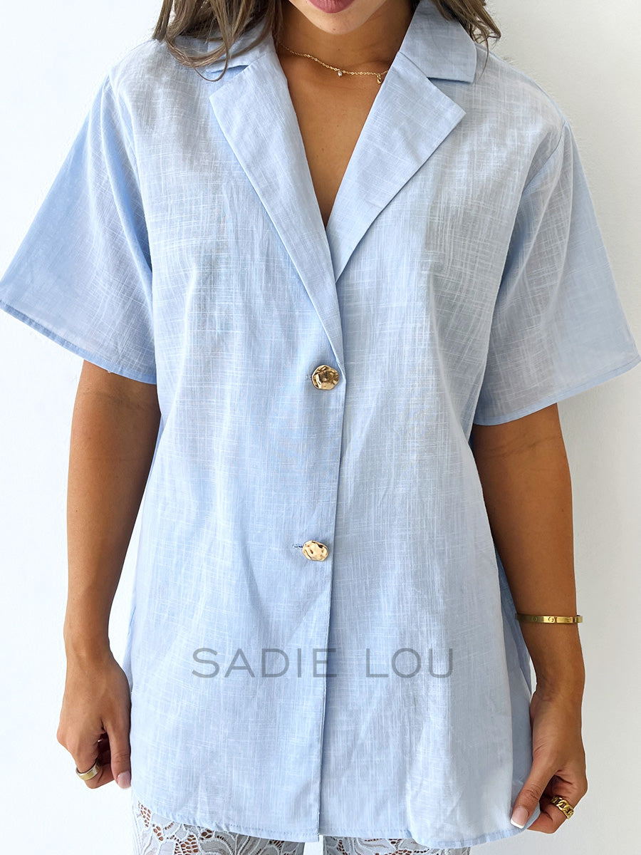 Tailored Collar: A structured collar provides a sharp, polished contrast to the soft blue hue.