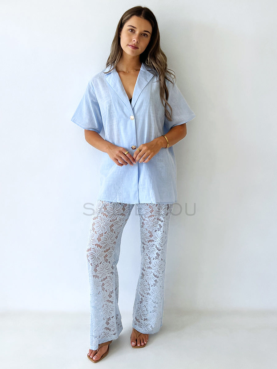 Embrace ethereal sophistication with the Belle Lace Pant Set, a dreamy pairing designed for the modern romantic. Rendered in a delicate, eye-catching powder blue, this set features intricate lace work and crisp tailoring, making it perfect for resort wear, special occasions, or elevating your everyday style.