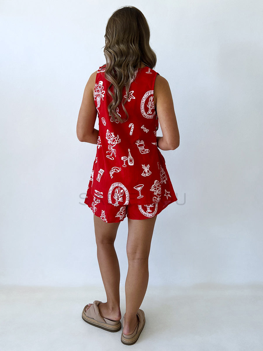Make a bold festive statement with this coordinating short set, designed in a vibrant red base with a delicate white fine-line patchwork of holiday motifs. From candy canes and bells to martini-sipping Santas, lobsters, mermaids, stars, Christmas trees, and more, every detail brings playful Christmas charm to life.