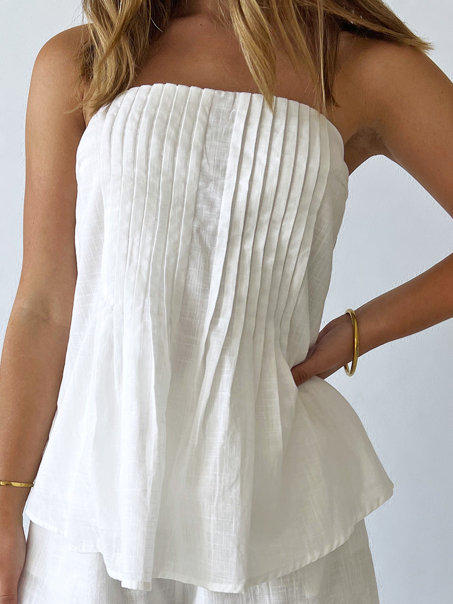 Turn heads with this effortlessly stylish two-piece set, featuring a sleek pleated strapless top paired with relaxed elasticated shorts.