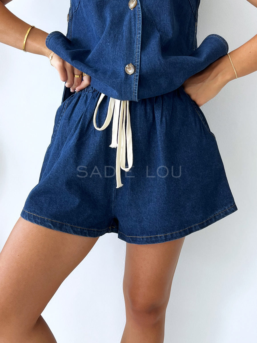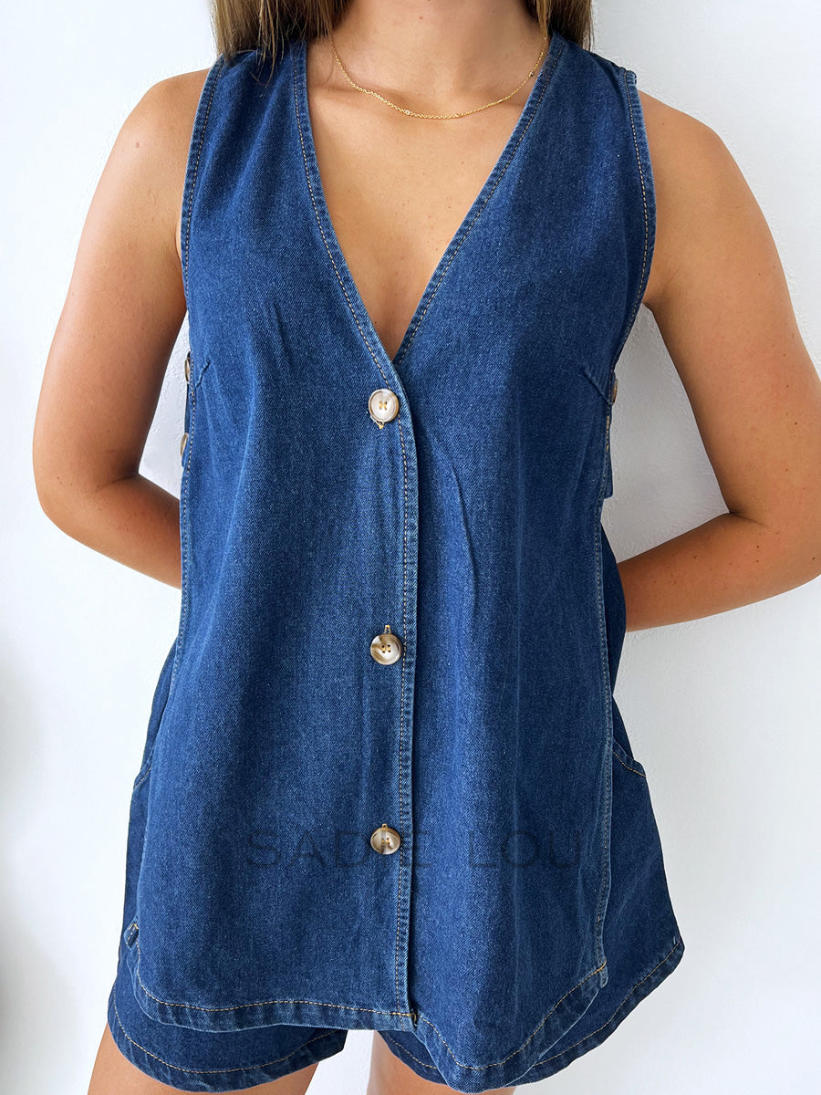 This casual denim set features a vest-style top with a V-neck and button-up front, designed with a small connecting panel with two buttons that links the front and back pieces for a subtle, structured detail. The matching shorts have an elastic waistband and two side pockets for comfort and practicality.