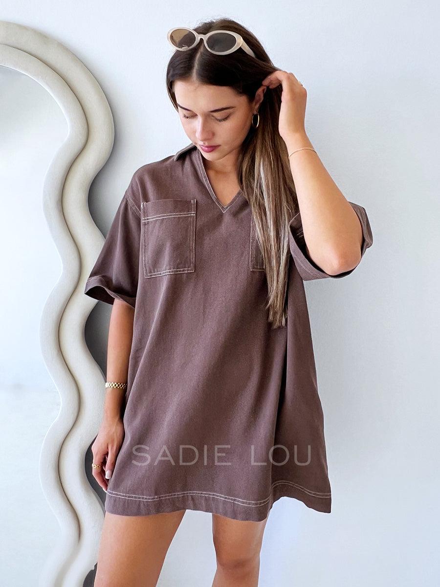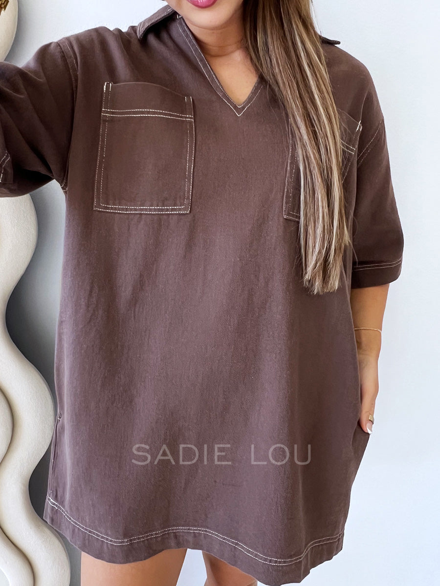 Designed with a structured collar and a modest, not-too-deep V neckline, it strikes the perfect balance between relaxed and refined. Two front chest pockets add a touch of utility-inspired detail, while the short sleeves keep the look easy and versatile. A contrasting hem detail finishes the dress with subtle dimension and added interest.
