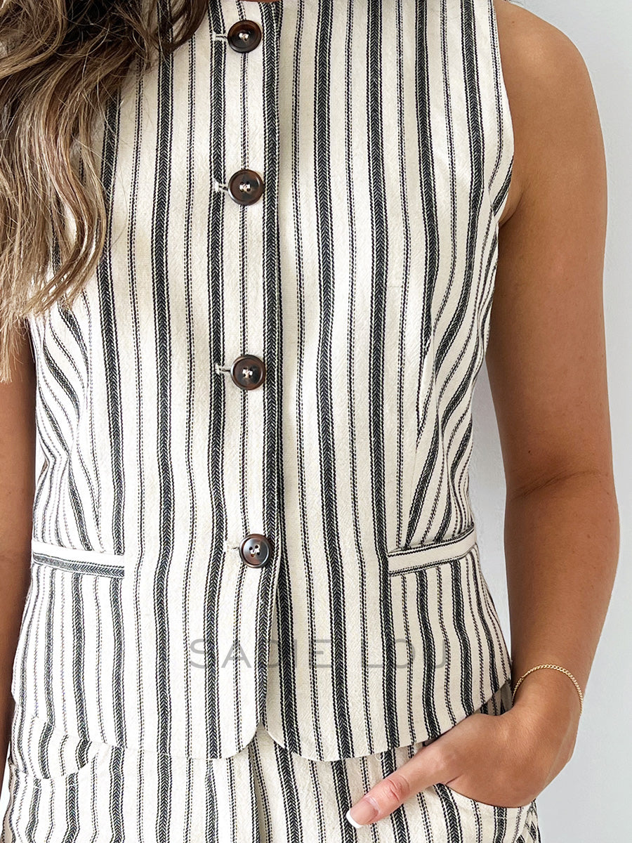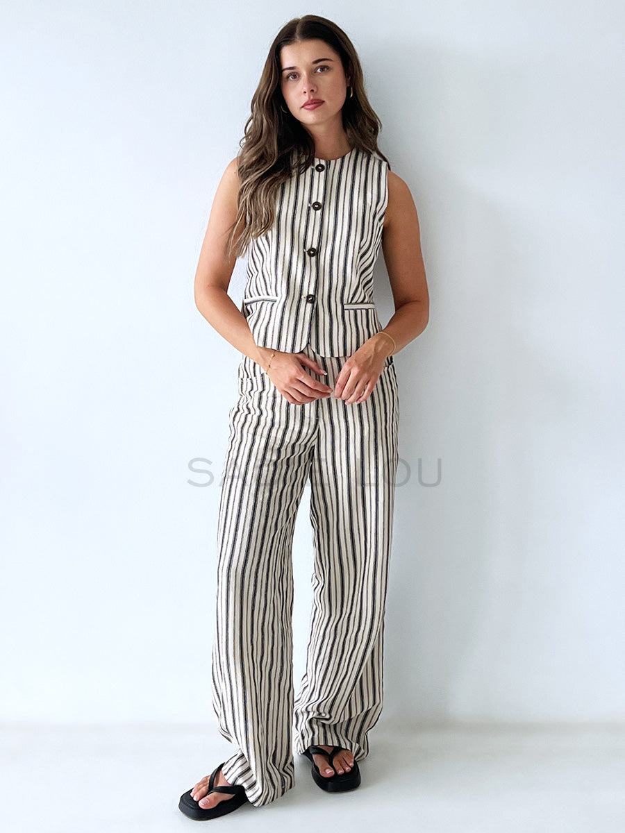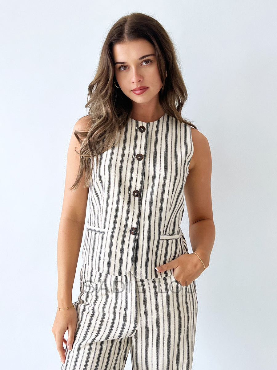 This matching top features the same crisp white base with black stripes, creating a bold yet timeless look. Designed to pair perfectly with the coordinating pants, it showcases the same stripe pattern for an effortlessly put-together set.