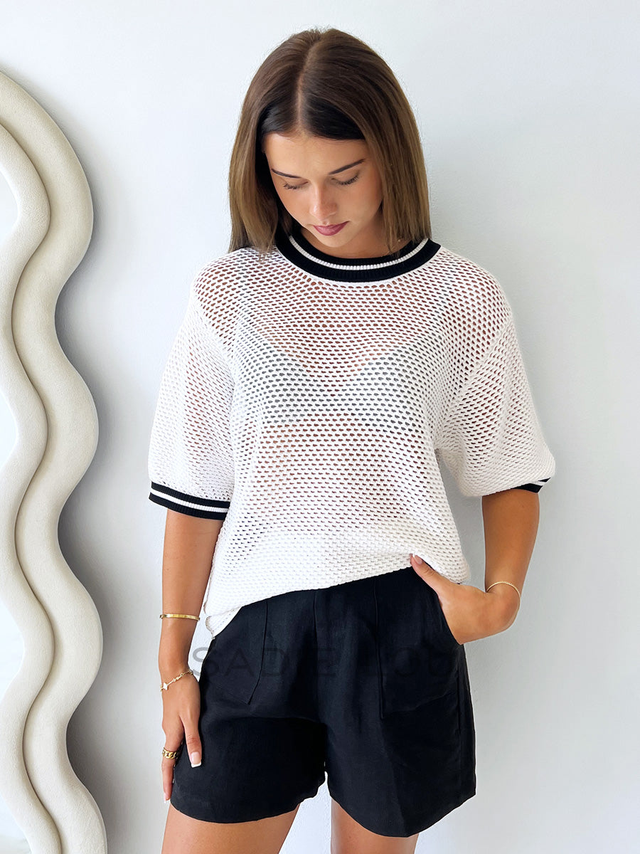 Elevate your layering game with this chic fishnet knit top. Crafted from a lightweight blend of 55% viscose and 45% nylon, the top features a sheer, breathable design with no lining. The standout black-and-white detailed trim along the collar and sleeves adds a touch of sophistication and contrast to the crisp white base.