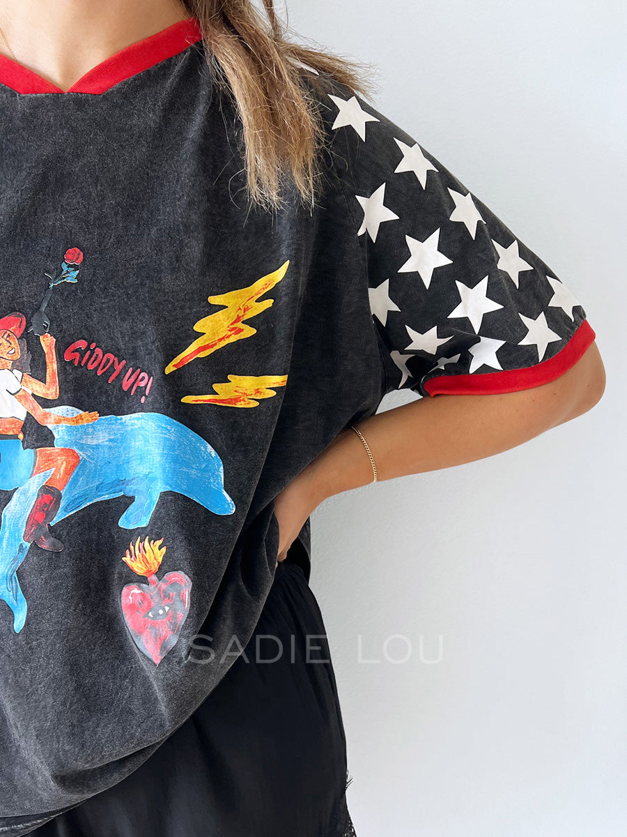 A playful twist on a classic graphic tee, this black and redT-shirt brings personality and charm to your everyday wardrobe. Featuring the phrase “Giddy Up” alongside a fun, eye-catching graphic of a cowgirl riding a dolphin, this design blends western spirit with a splash of coastal cool for a truly unique statement piece.