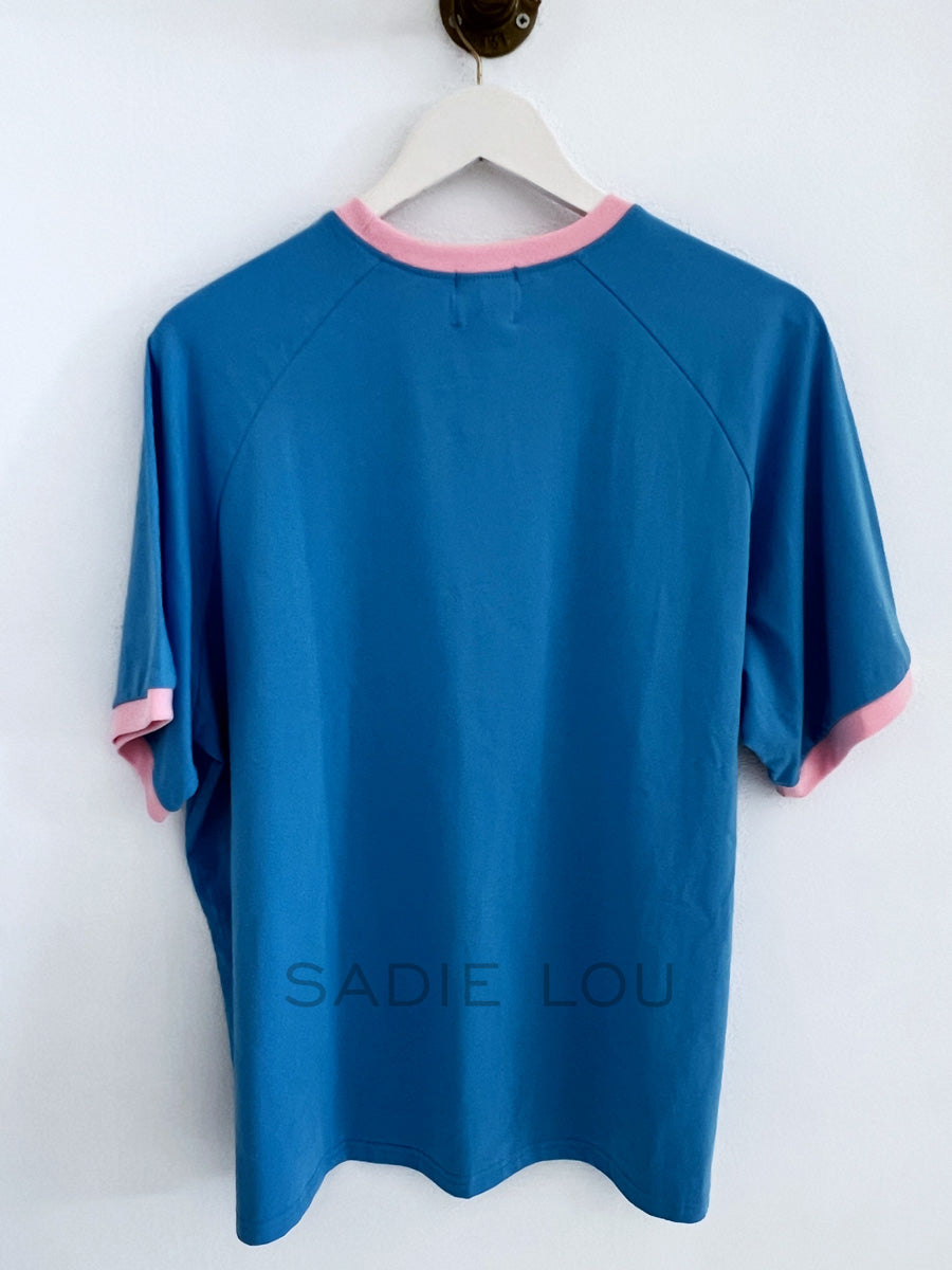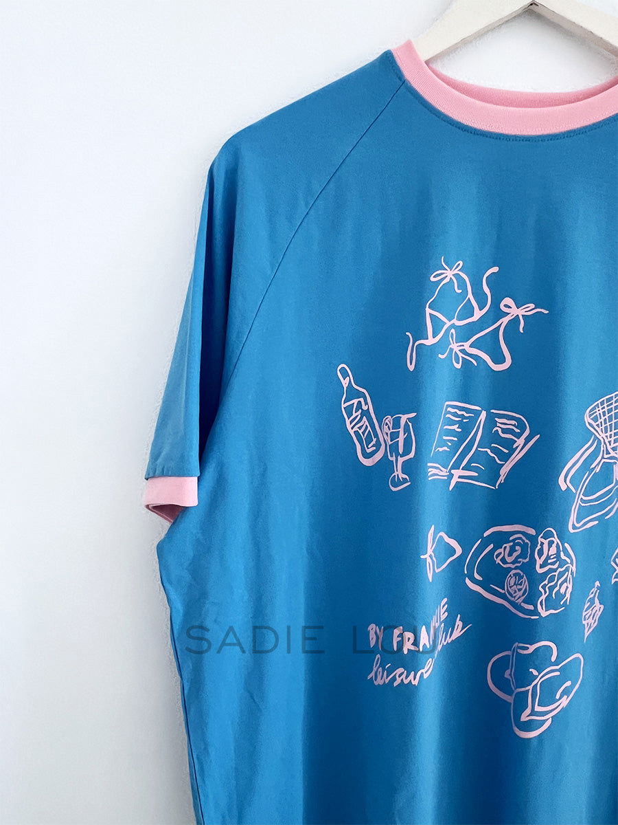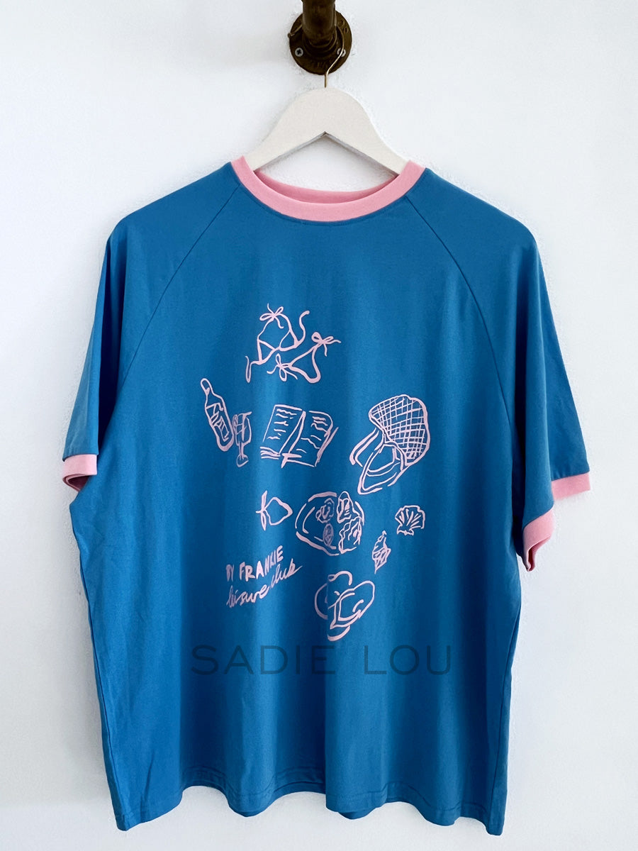 This blue short-sleeve tee features pink trim detailing along the collar and sleeves, adding a soft contrast. The front is finished with a series of delicate fine-line illustrations, including a bikini, cocktail, book, lemon, oysters, sunglasses, bag, and shells, creating a playful, summer-inspired graphic.