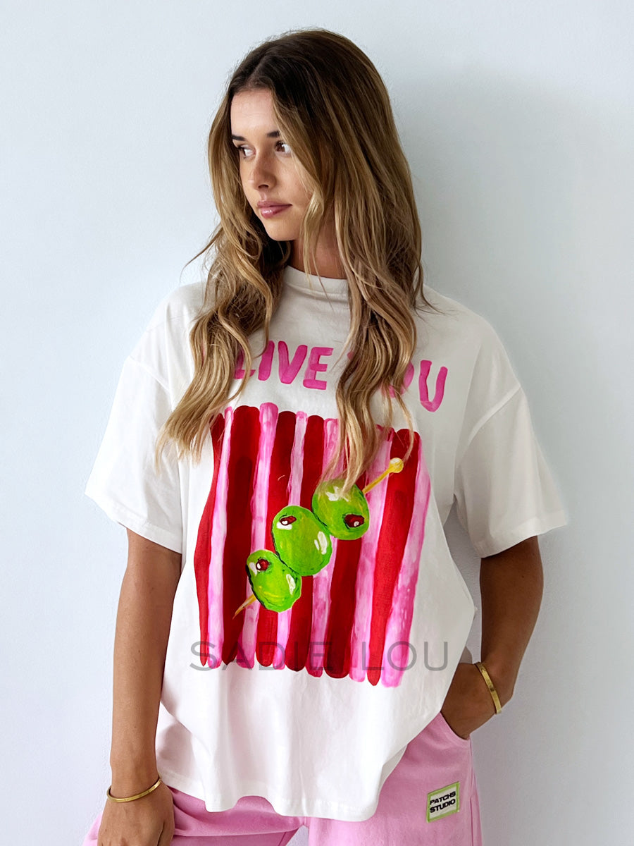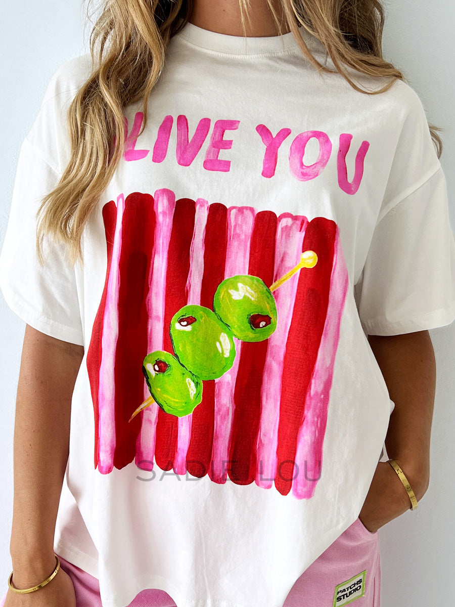 Set on a crisp white base, the T-shirt features bold fluoro pink lettering that reads “OLIVE YOU,” bringing a bright pop of color and a cheeky message to the design.