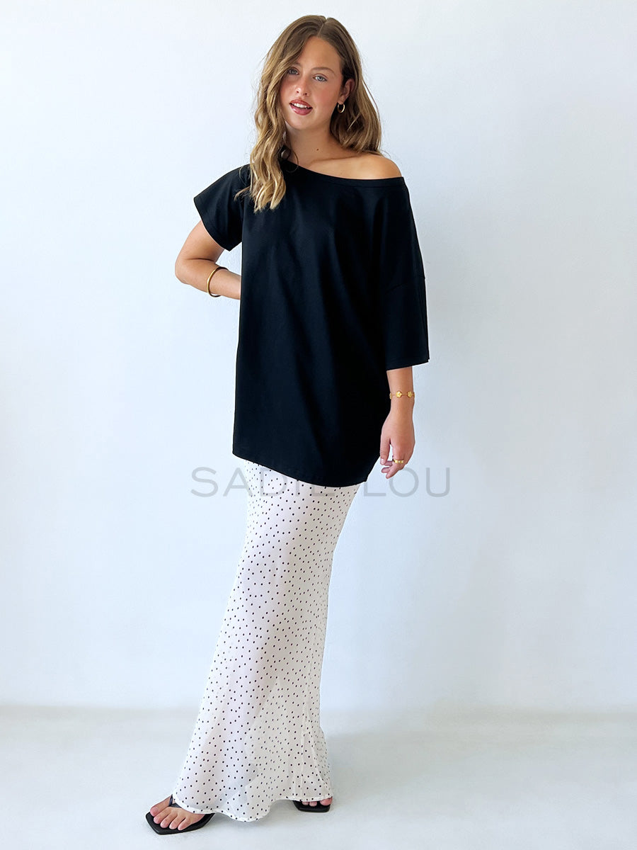 The Shay Tee is your everyday essential with a relaxed twist. Designed as an off-shoulder top, it features a soft, breathable feel made from 100% cotton. The loose, oversized fit gives it an effortless look that’s easy to style up or down.