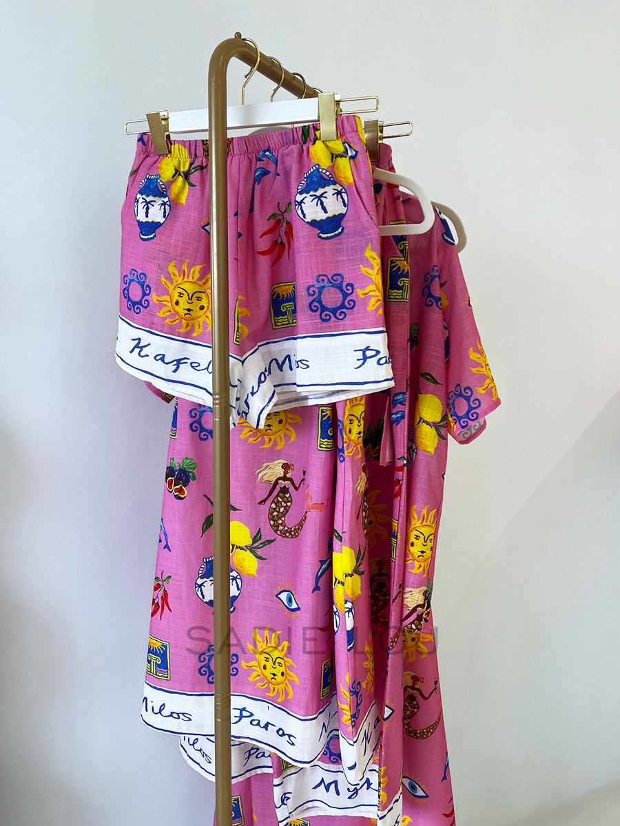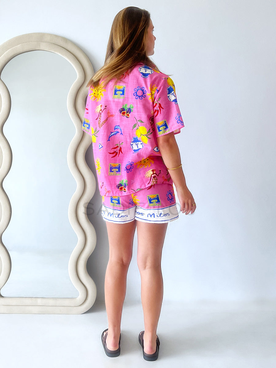 Bring the energy of the Mediterranean to your everyday look with the Solstice Tie Blouse. Featuring our exclusive, richly detailed Greek-inspired print on a vibrant hot pink cotton, this top is the perfect warm-weather statement piece.