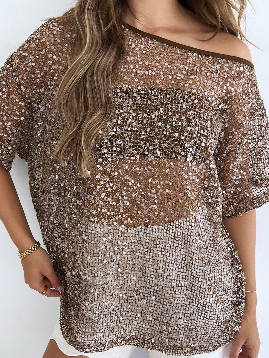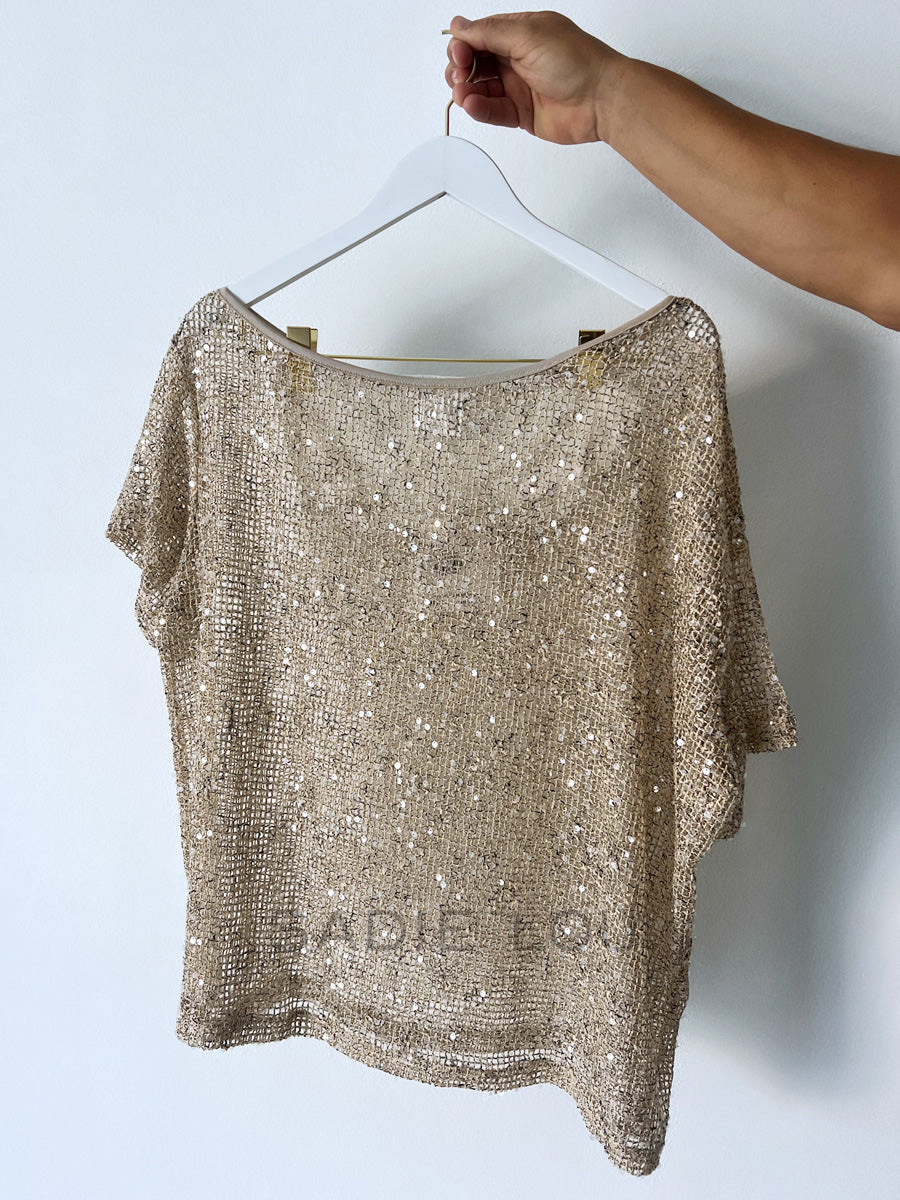 Elevate your wardrobe with this oversized knit tee, exquisitely crafted from 100% cotton for a lightweight, breathable feel and a fluid, effortless drape. Presented in a soft beige tone, the piece is adorned with delicate all-over sequins that catch the light with subtle sophistication. The sheer knit construction and relaxed, oversized silhouette offer a modern, refined edge—perfect for layering or wearing alone as a statement piece.