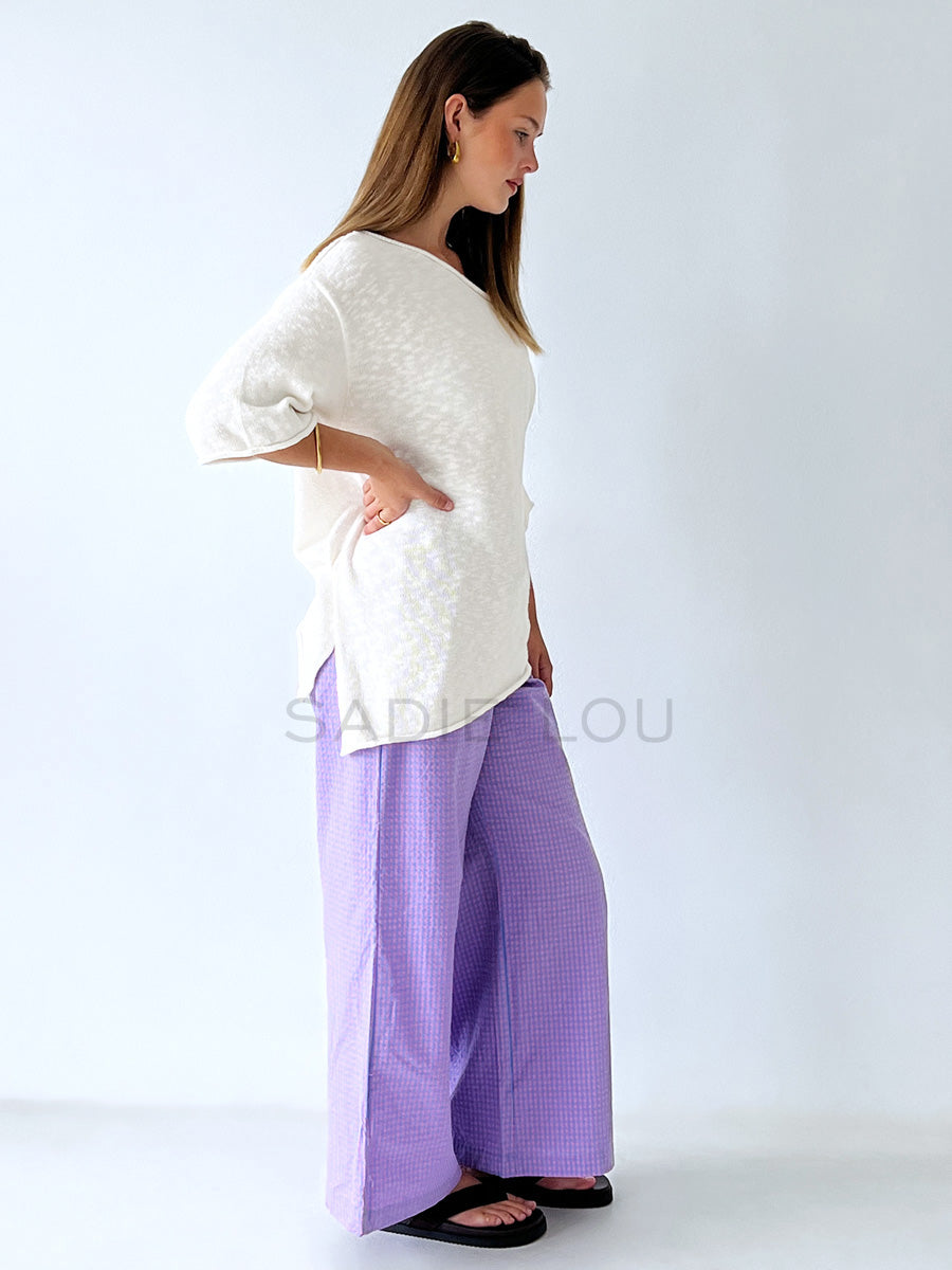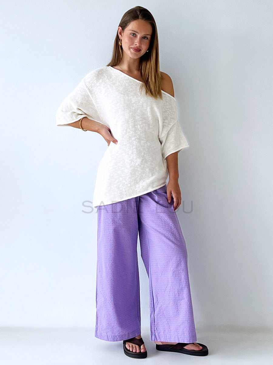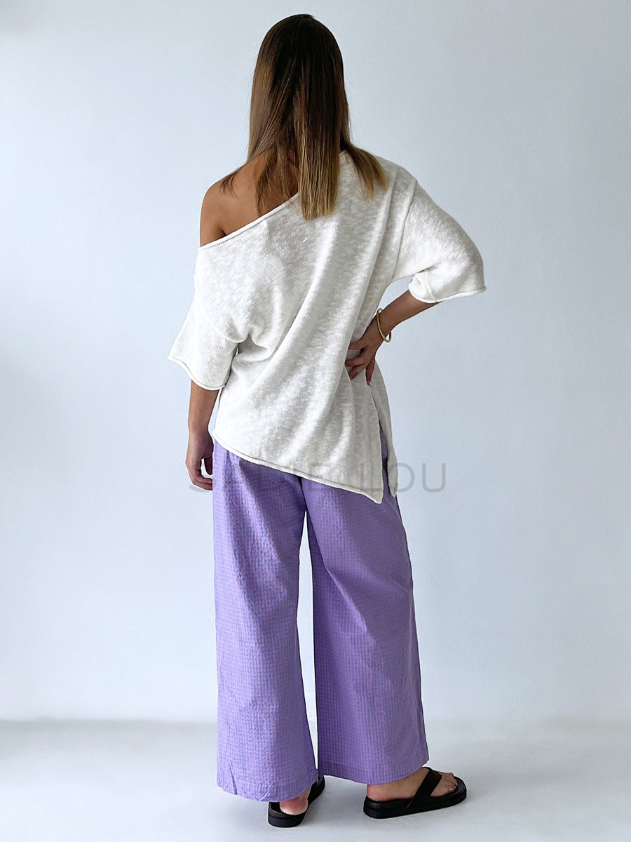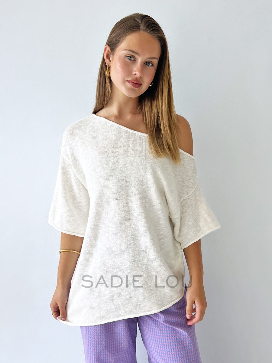 This white knit top features an off-the-shoulder design with an asymmetrical hem for a modern, statement look. One sleeve is longer than the other, adding an edgy and contemporary touch. Made from 100% cotton, it offers a soft, breathable feel with comfortable stretch.