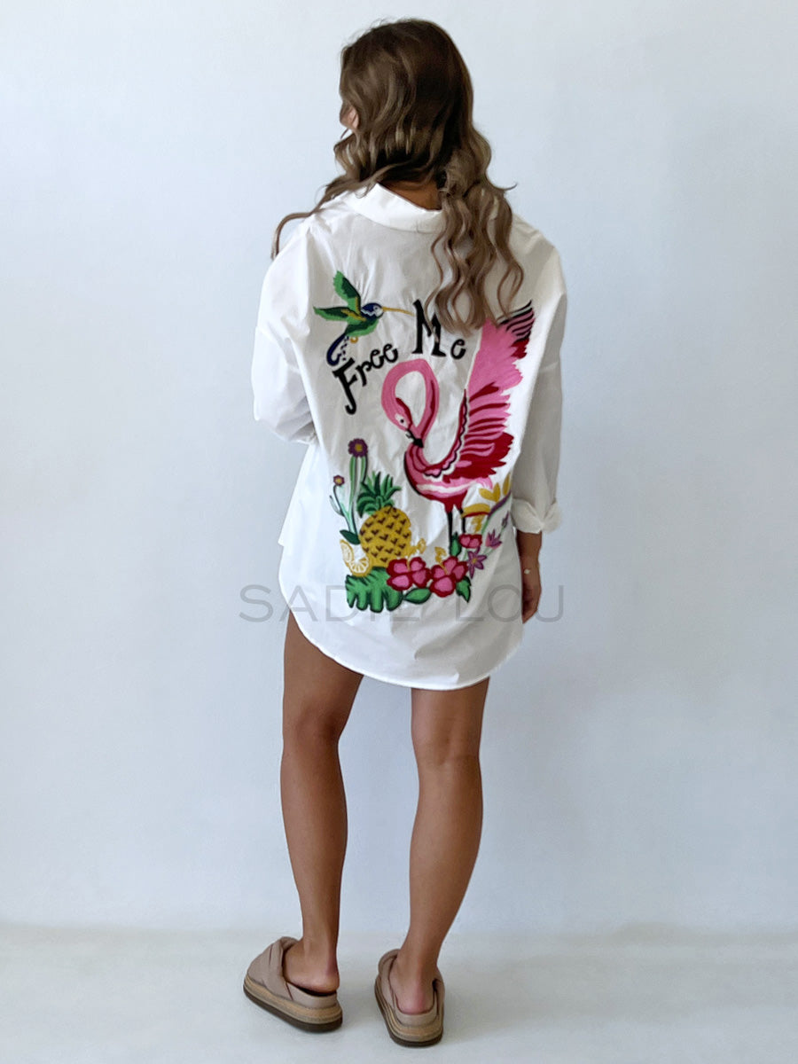 Tropical Motif: Surrounding the message is a joyful collection of colorful embroidery featuring a striking flamingo, another soaring bird, delicate floral motifs, and lush tropical fruits.