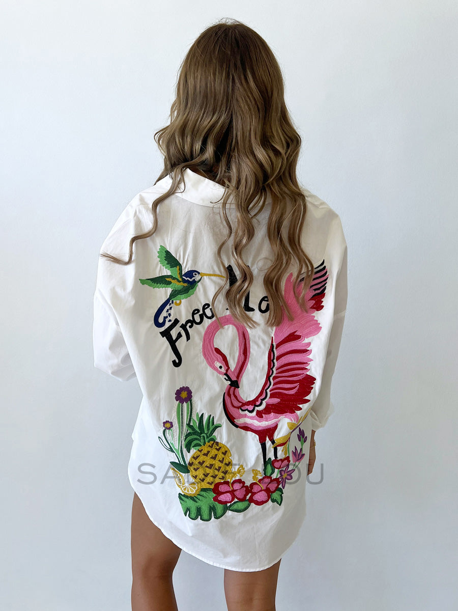 The back of the blouse is transformed into a vibrant canvas with intricate embroidery that speaks of freedom and faraway places:
