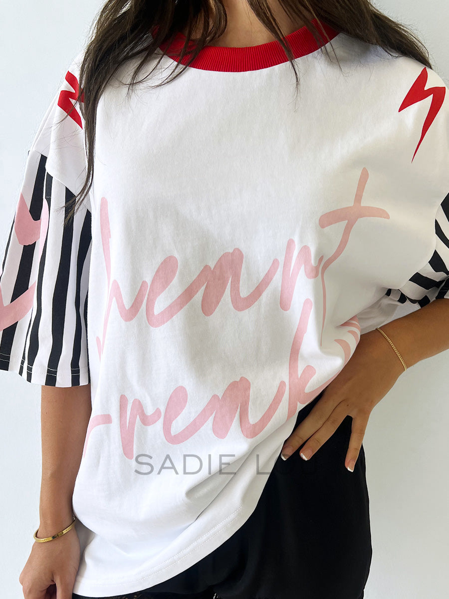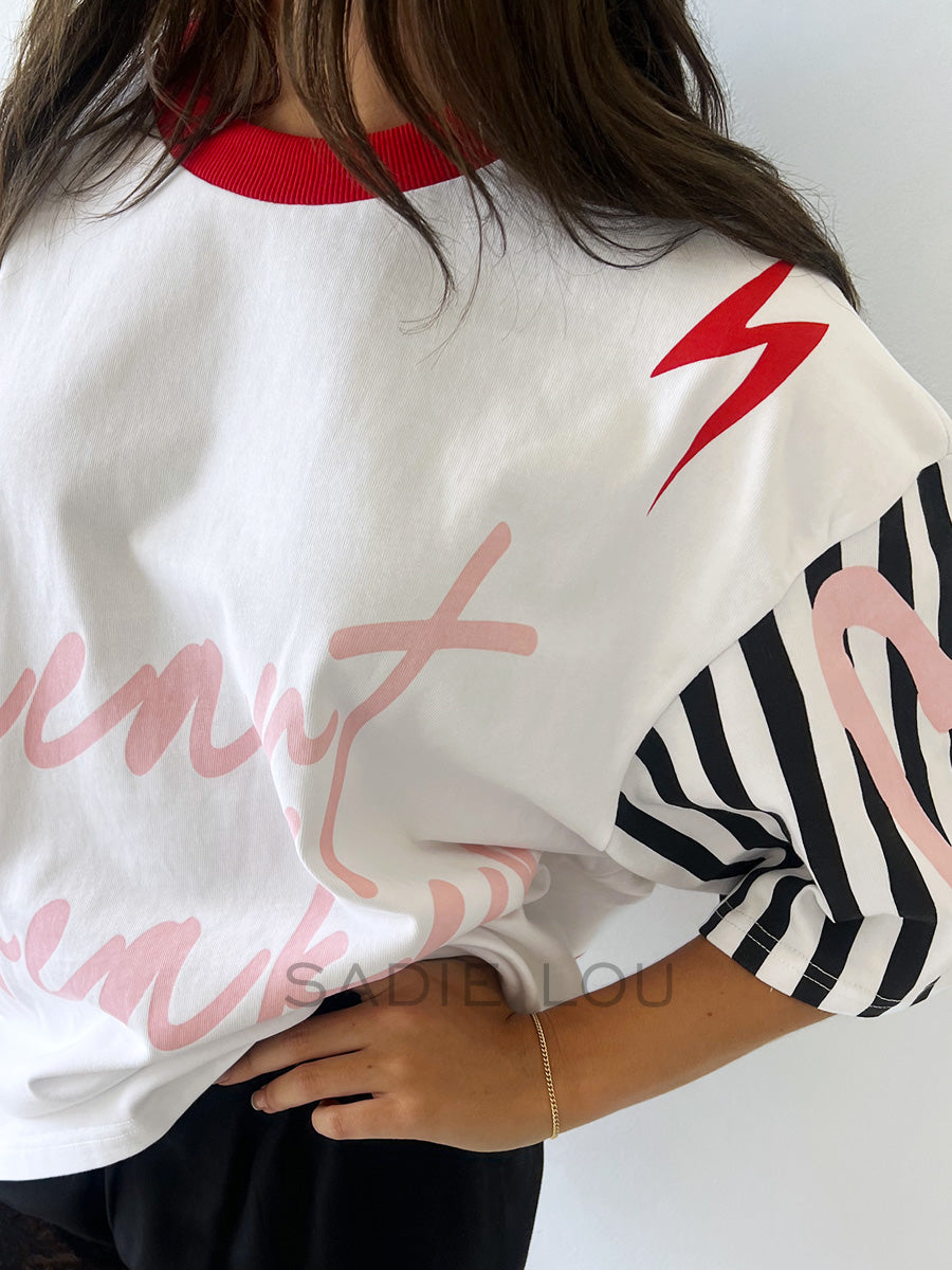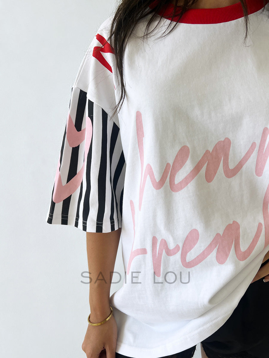 Make a statement in this 100% cotton tee featuring “Heartbreaker” in playful pink running script across the front. Black-and-white striped sleeves and a red contrast neckline add sporty, fun detailing to this wardrobe-essential.