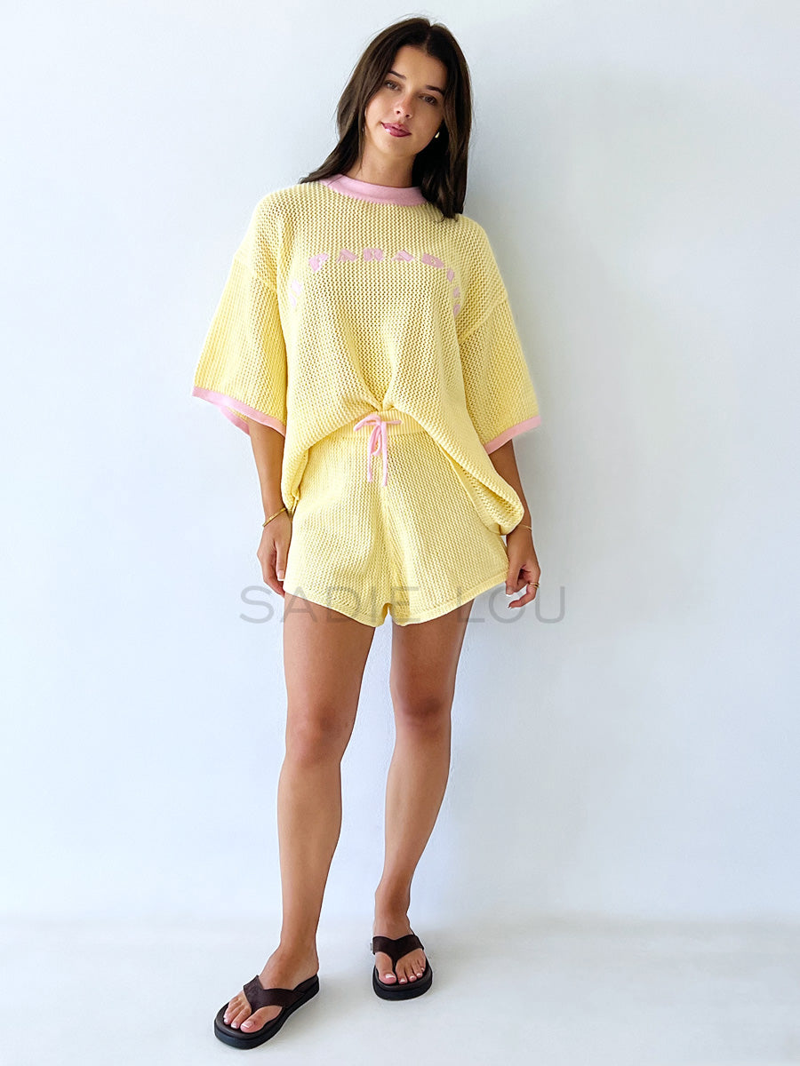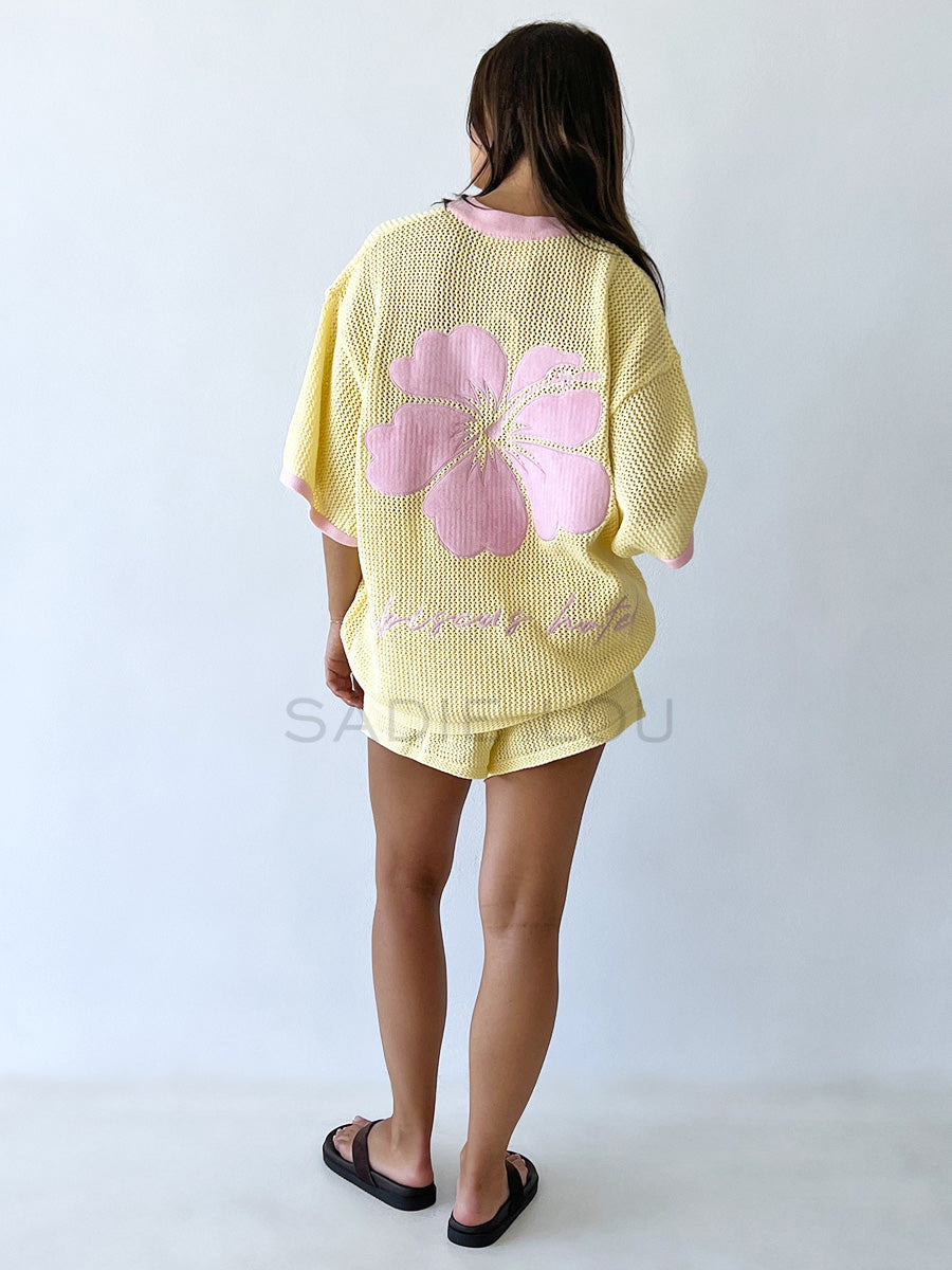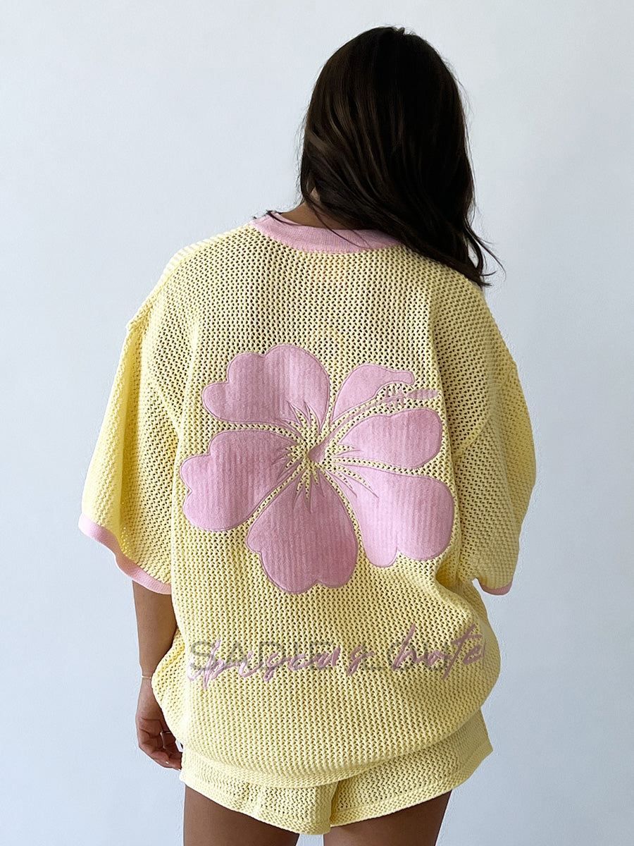 This 100% cotton knit top features pink contrast detailing for a fresh, feminine look. The front is finished with the wording “il paradiso” in pink, complemented by a pink trim around the neckline and sleeves. On the back, a pink hibiscus graphic adds a statement touch, with “Hibiscus Hotel” printed beneath it.