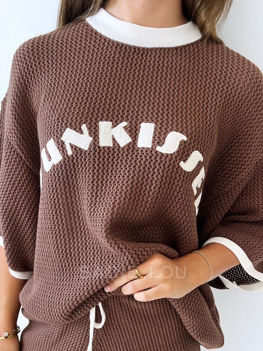 Crafted from 100% cotton knit, this chocolate-brown top features “sunkissed” printed in white across the front. White contrast trim at the neckline and sleeves adds a fresh, sporty touch. On the back, a white hibiscus graphic is paired with the wording “hibiscus hotel” for a statement finish.