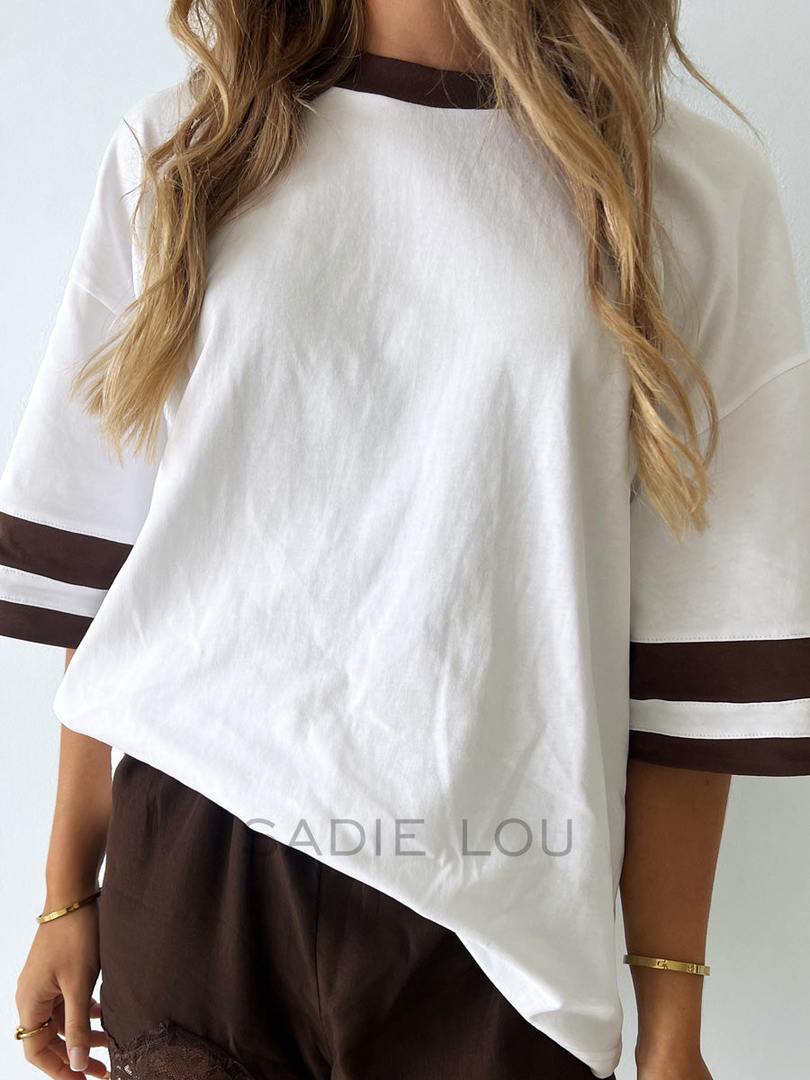 Classic White Tee with Brown Trim & Sleeve Stripes