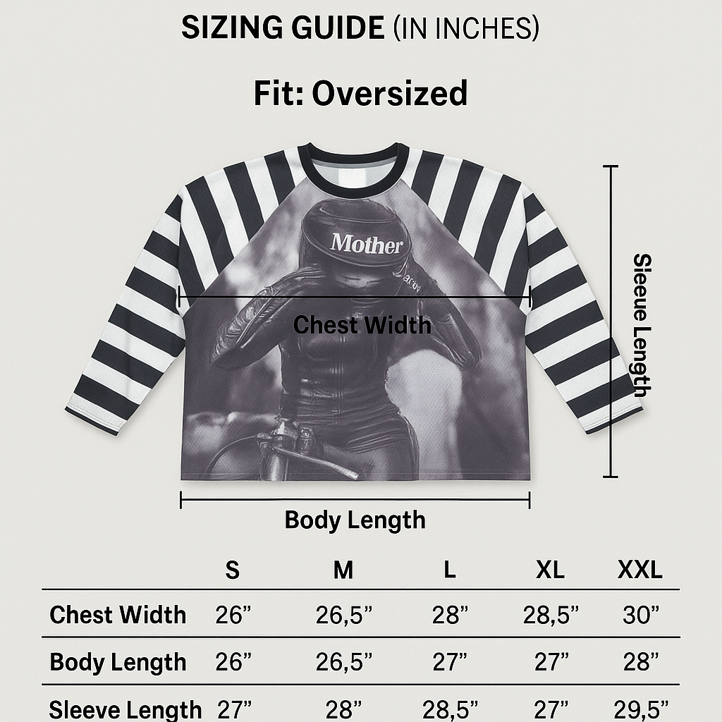 The MOTHER Racing Jersey is crafted for the mother who leads with strength and style. This oversized long-sleeve mesh top features breathable athletic fabric, eye-catching black-and-white stripes, and the iconic MOTHER arm patch. Its unisex oversized design, lightweight mesh, and relaxed drop shoulder fit combine to offer both comfort and a confident look, perfect for fast-paced days or casual moments.