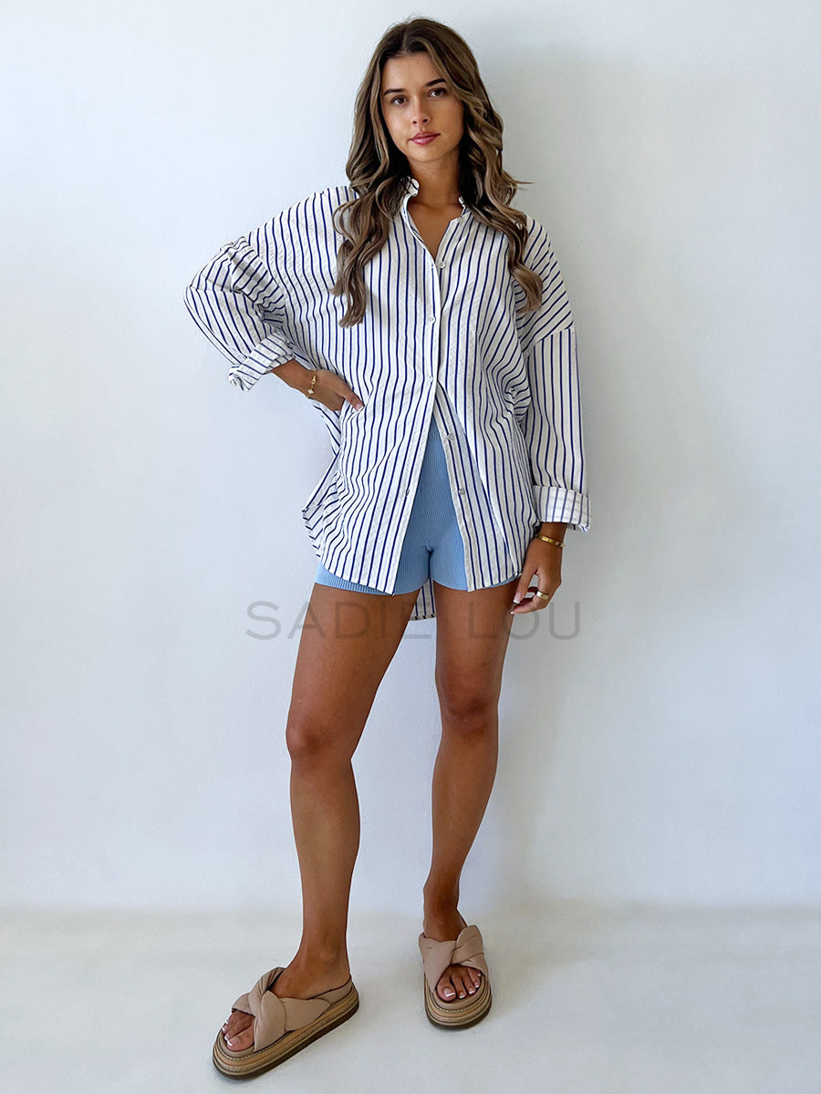 Capture the vibrant energy of Brazil with this stylish blue and white vertical striped button-up blouse. This piece blends a crisp, classic silhouette with stunning, vacation-ready embroidery on the back, making it a true standout.