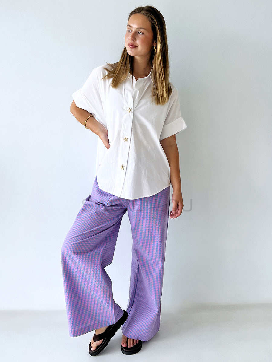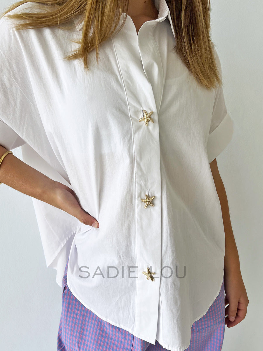 This short-sleeve blouse features a classic button-up silhouette accented with elegant gold seashell buttons. Crafted from 100% breathable cotton, it offers a lightweight and comfortable feel, perfect for everyday wear or warm-weather styling.