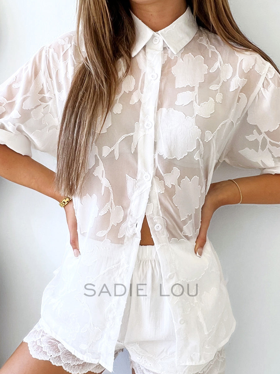 Crafted from 100% lightweight polyester, the sheer fabric is adorned with floral embroidery throughout, adding texture and dimension while keeping the look refined. Available in both classic black and crisp white, it’s a versatile piece that can be styled endless ways.