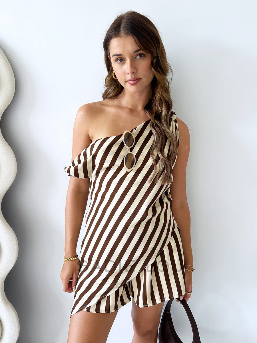 The shorts are designed with a relaxed elastic waistband and two functional side pockets for everyday wearability. The matching top features an off-the-shoulder neckline and an asymmetrical hem, creating a flattering, contemporary shape with a touch of movement. Worn together or styled separately, this set is a standout choice for warm-weather dressing.