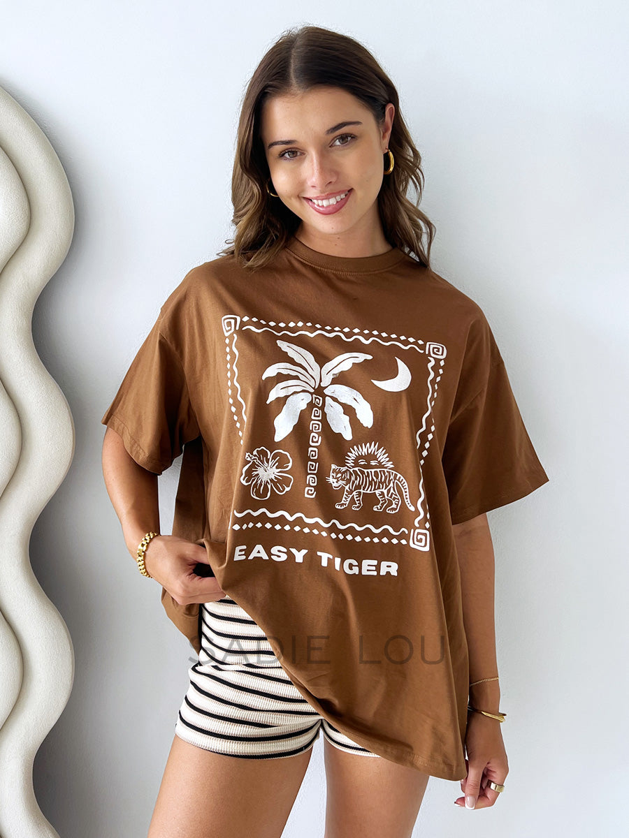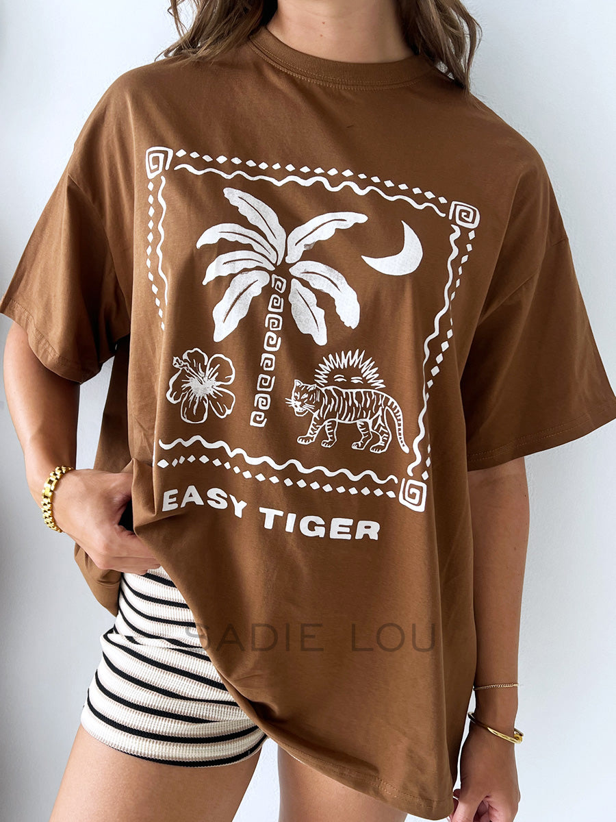 Casual, bold, and effortlessly stylish, this chocolate brown cotton tee features a striking white graphic print of a hibiscus, palm tree, tiger, sun, and moon, giving it a playful, nature-inspired edge. “Easy Tiger” is printed along the bottom in crisp white for a fun finishing touch. Crafted from 100% cotton, it offers a soft, comfortable fit perfect for everyday wear.
