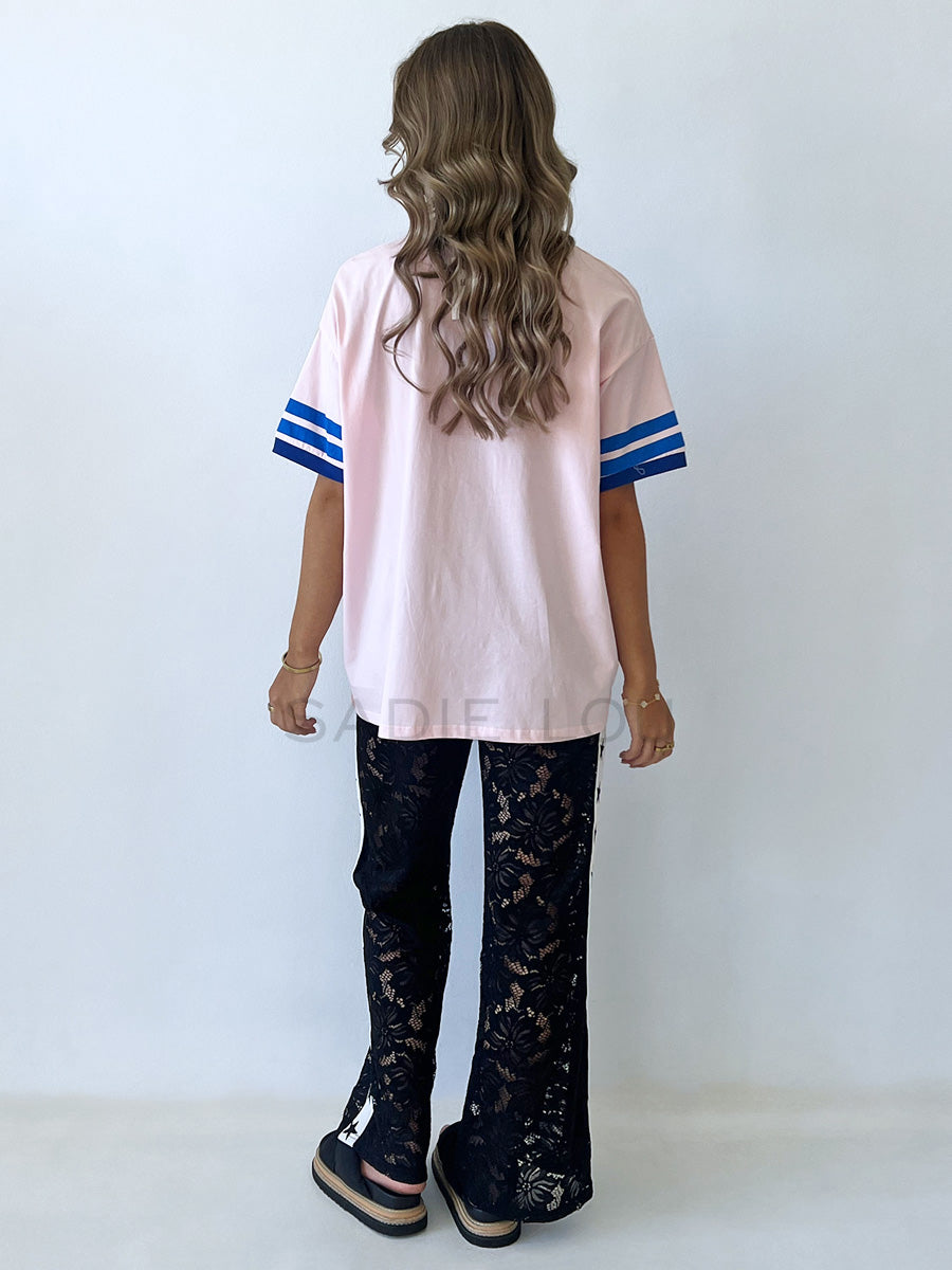 Ride into casual-cool style with this graphic Pink tee, crafted from 100% cotton for a soft, breathable fit. The tee features a Blue trim on the collar and sleeves, finished with a bold horizontal racer stripe at the sleeve ends for a sporty, retro touch.