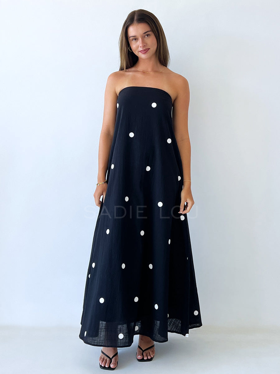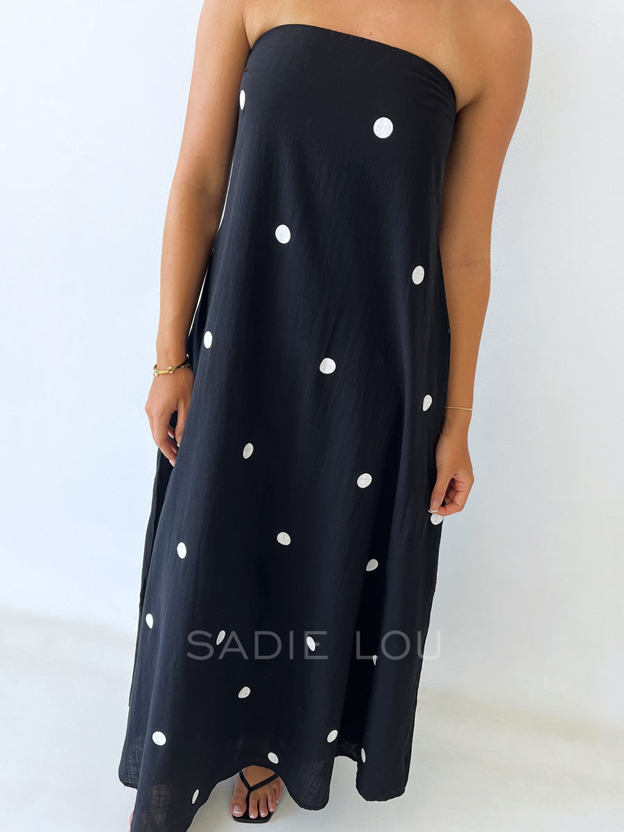 Finished in a classic white polka dot print on a Black this Dress offers a timeless yet playful look