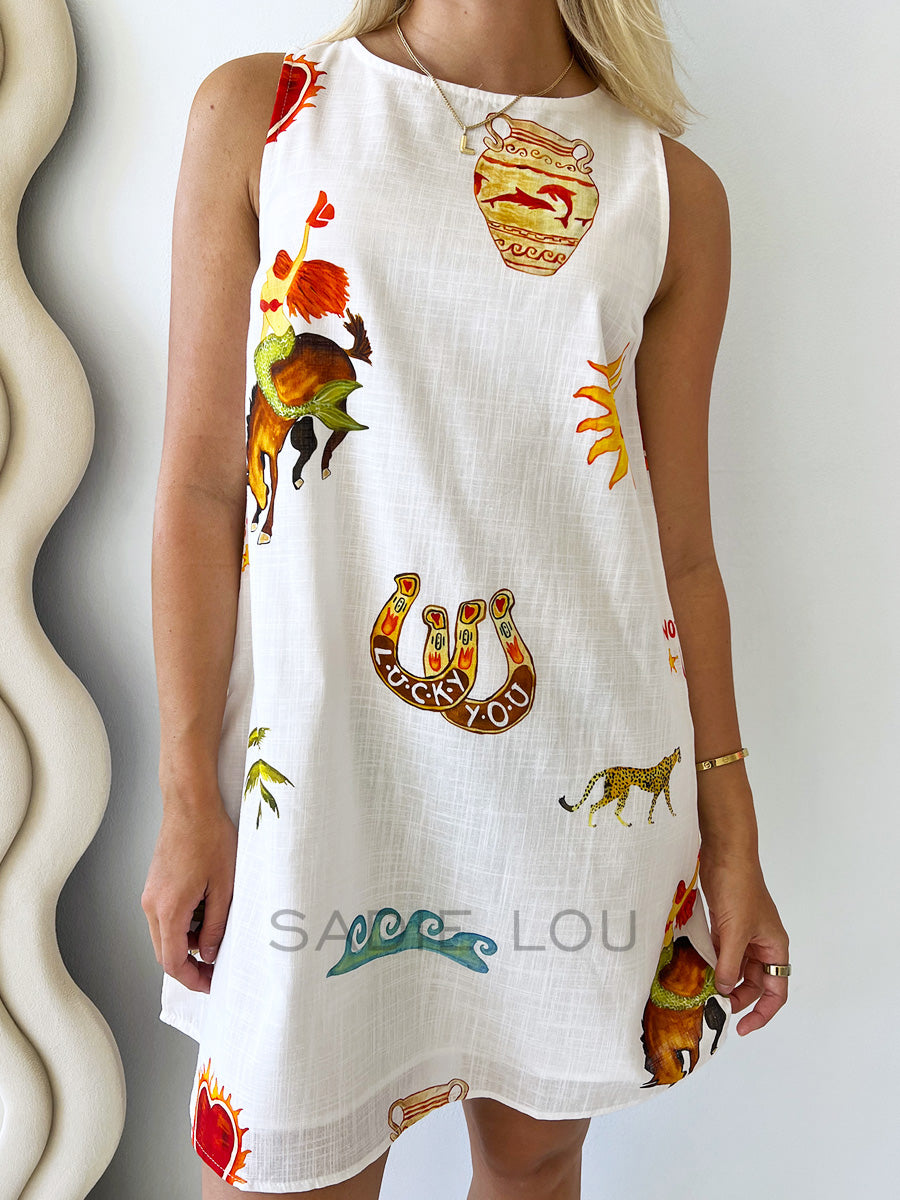 The crisp white base is the perfect canvas for the rich, eclectic print that tells a tale of good fortune and adventure: