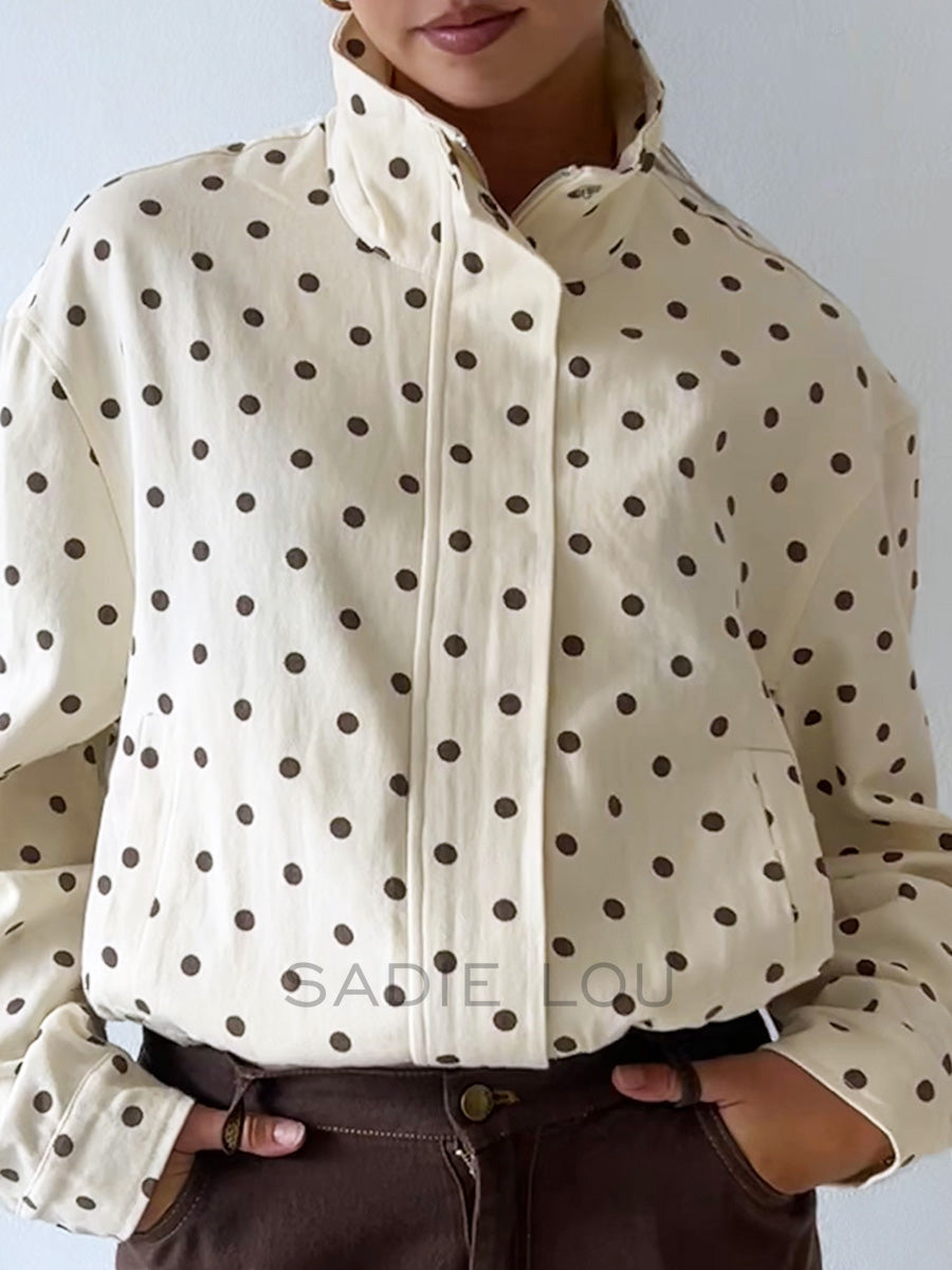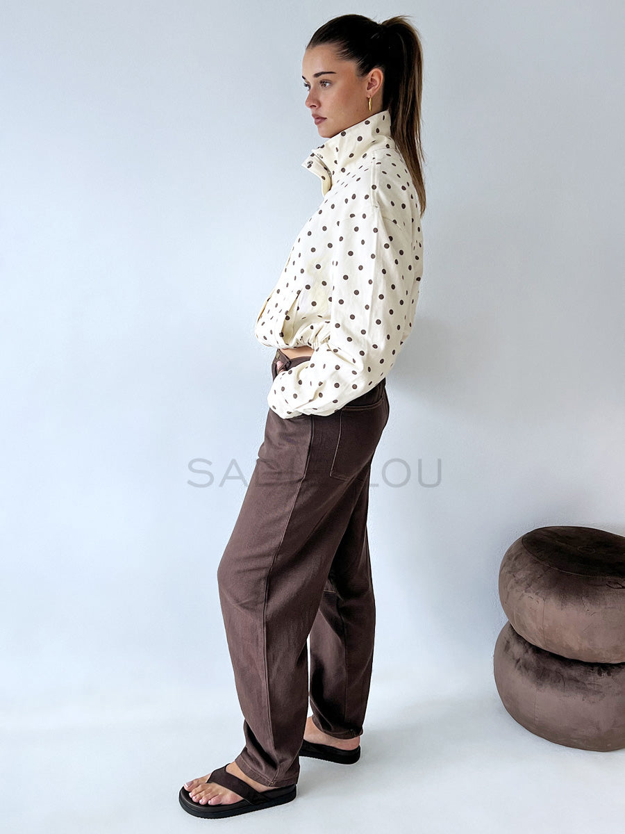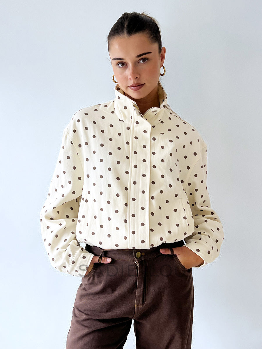 Stay effortlessly stylish with this must-have bomber jacket, featuring a rich chocolate and butter polka dot print finish for a luxe take on a classic silhouette.