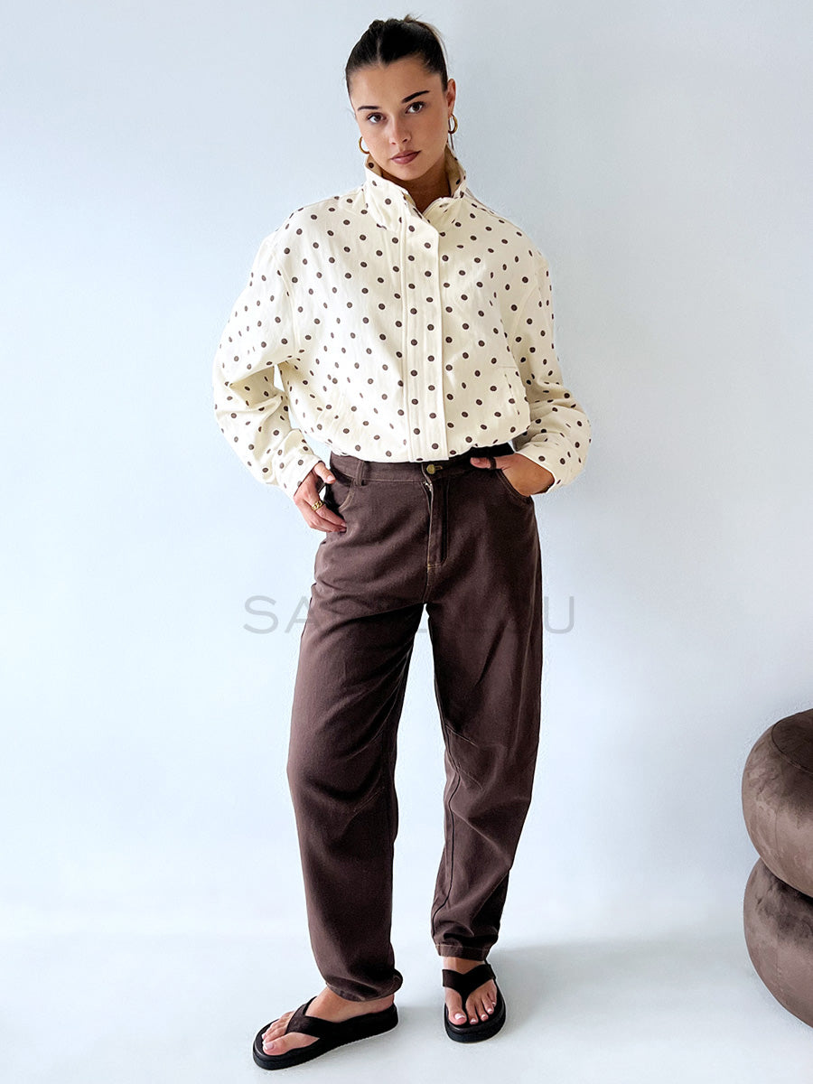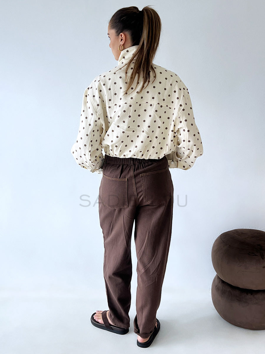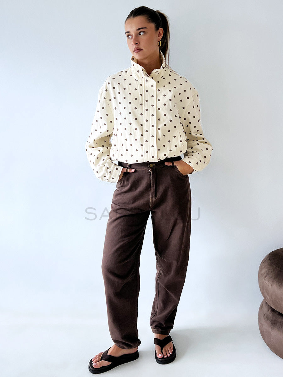 Stay effortlessly stylish with this must-have bomber jacket, featuring a rich chocolate and butter polka dot print finish for a luxe take on a classic silhouette.