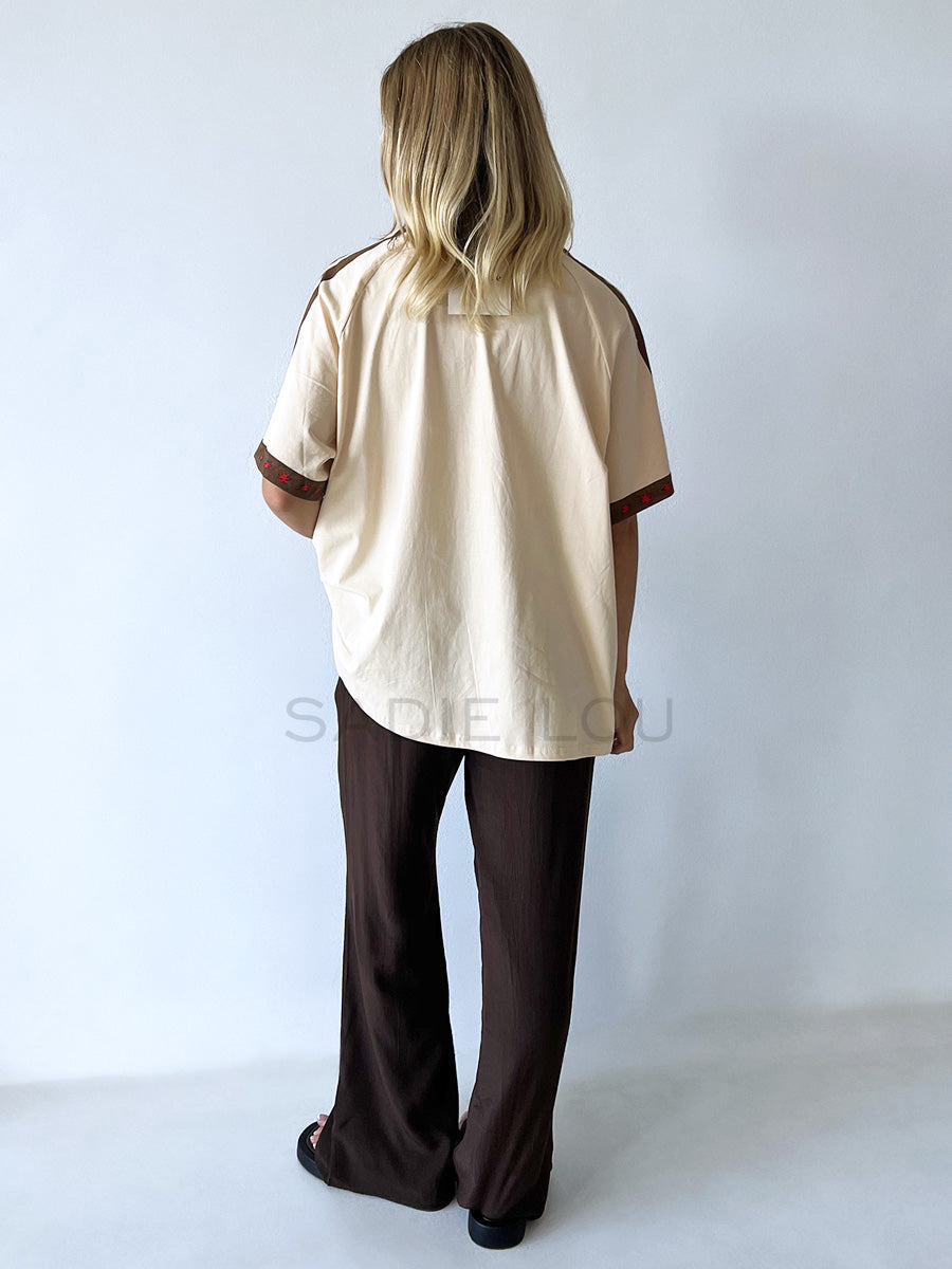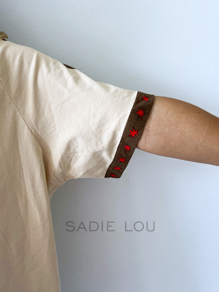 Sleeve Accent: The brown sleeve trim is accented with a repeated print of small red stars, adding a subtle pop of color and western flair.