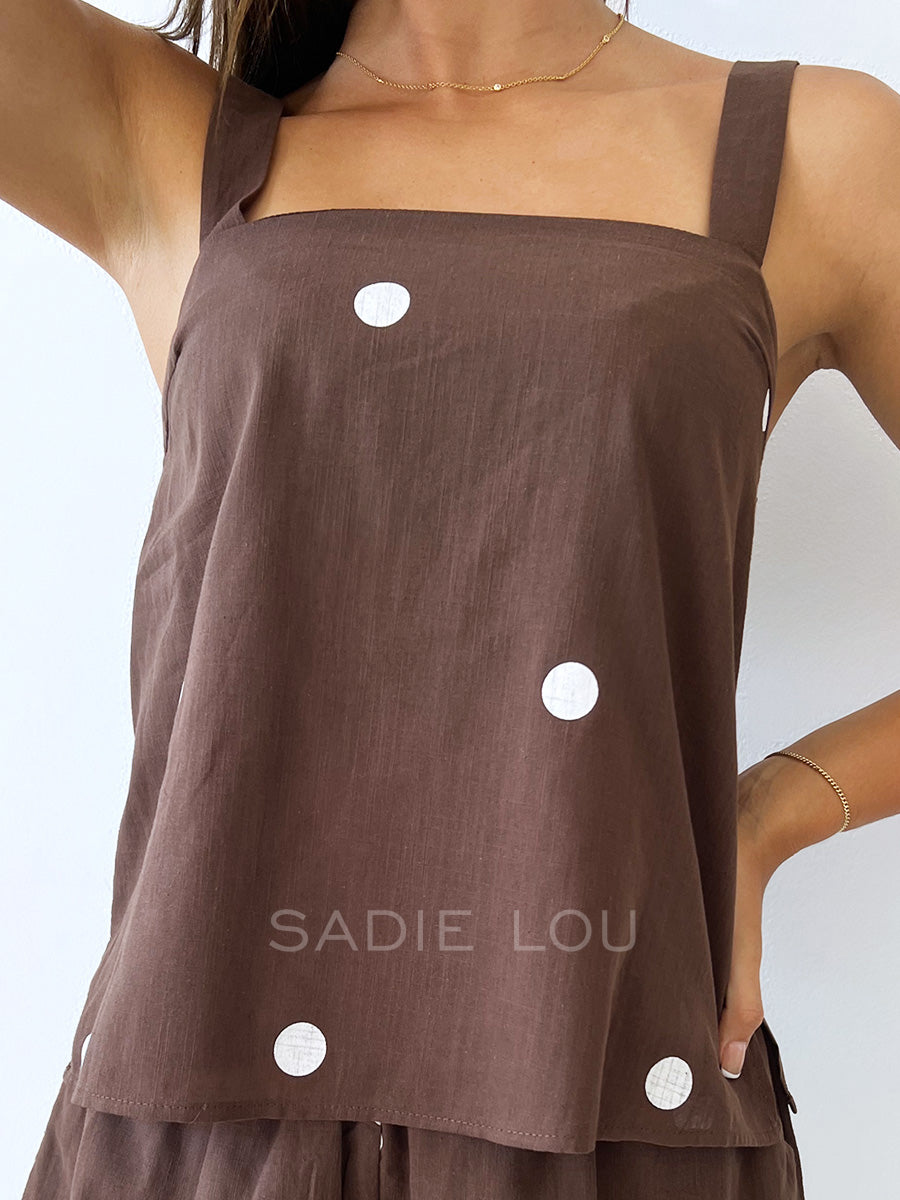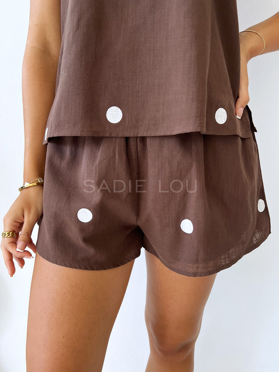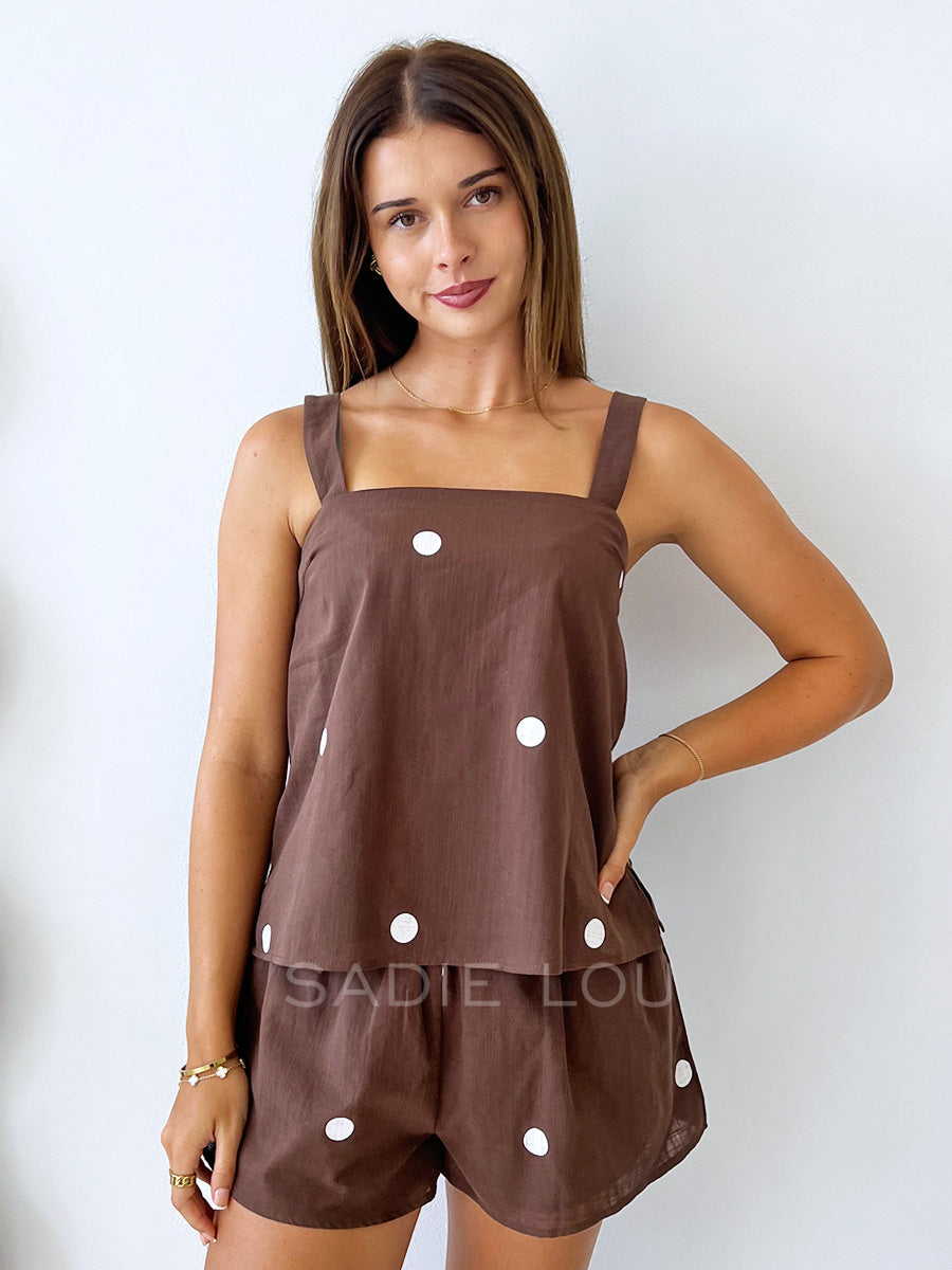 This playful set features a thick-strap tank top paired with matching shorts on a brown base with white polka dots. The shorts are designed with an elastic waistband, two side pockets, and a comfortable lined interior for a soft, breathable fit.