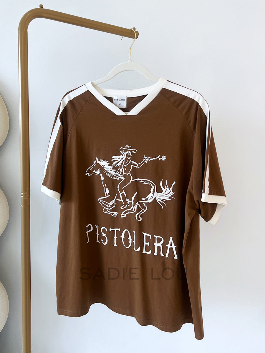 The shirt is dominated by a detailed graphic printed in fine-line white ink. The design features a fearless girl shooting a gun while riding a horse, embodying a rugged, adventurous spirit. Directly underneath the print is the single word "PISTOLERA" (meaning "female pistol shooter" or "gunfighter") in a matching white font.