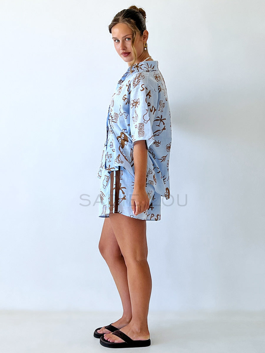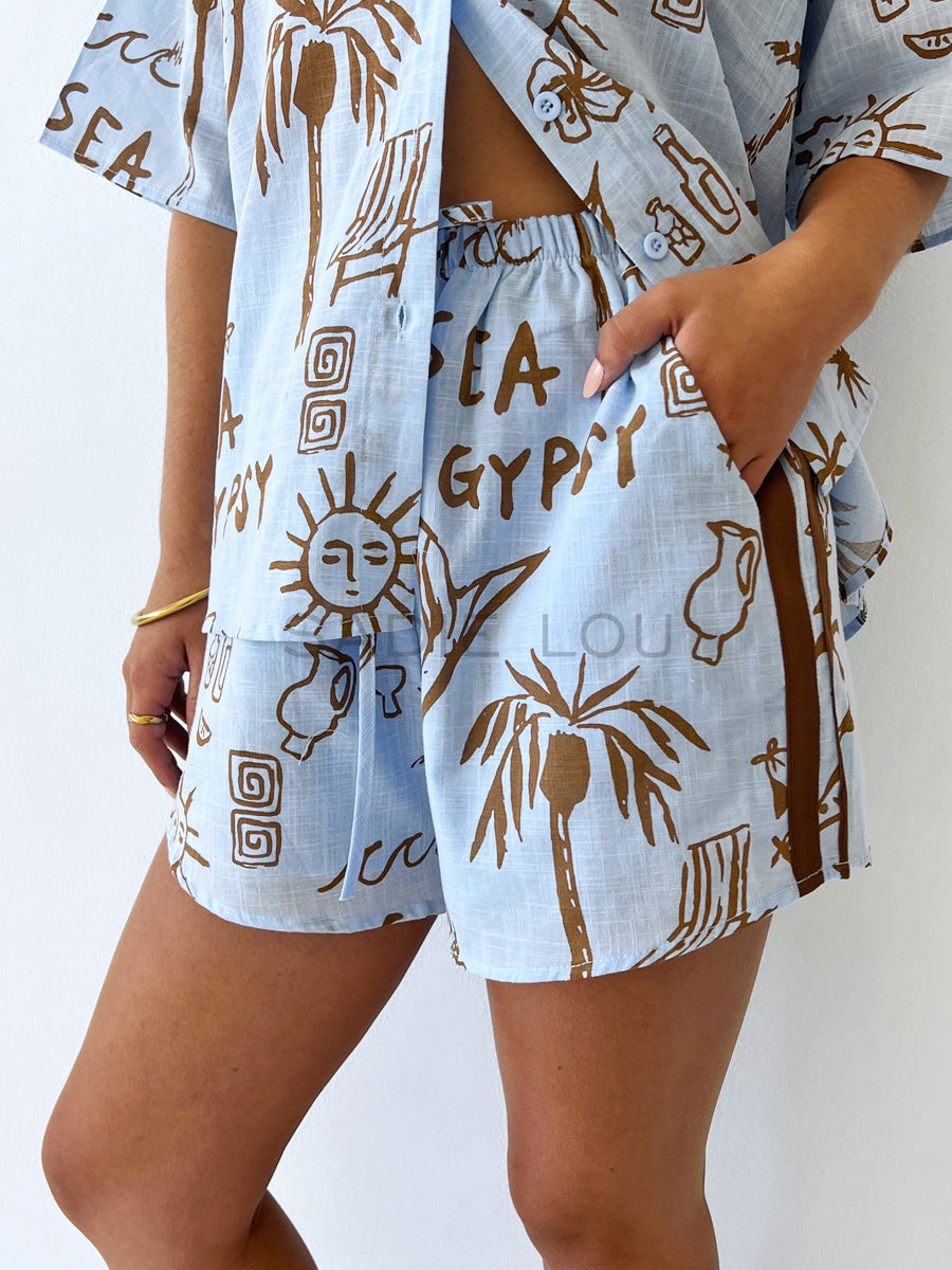 The coordinating 100% cotton racer shorts feature an elastic waistband with a faux drawstring, two side pockets and sporty choc racer stripes running down each leg. The blue fabric mirrors the blouse with the same tan patchwork illustrations for a cohesive, coastal-inspired look.