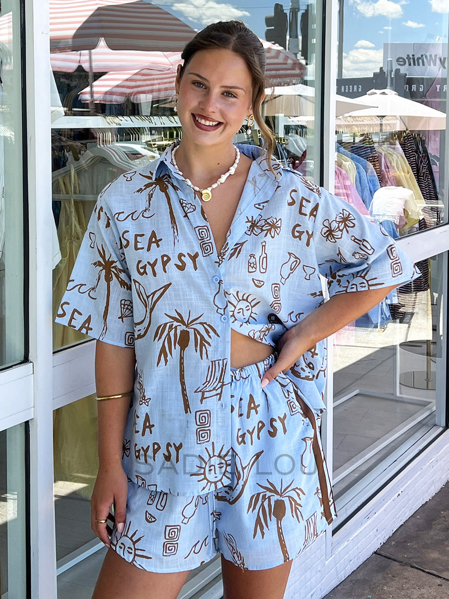 This short-sleeve button-up blouse is crafted from 100% cotton for a soft, breathable feel. Designed in a blue base, it showcases a tan fine-line patchwork print featuring mermaids, suns, fruit, lobsters, shells, starfish, palm trees, “Sea Gypsy” motifs and more. The relaxed silhouette makes it perfect for warm days and effortless matching.