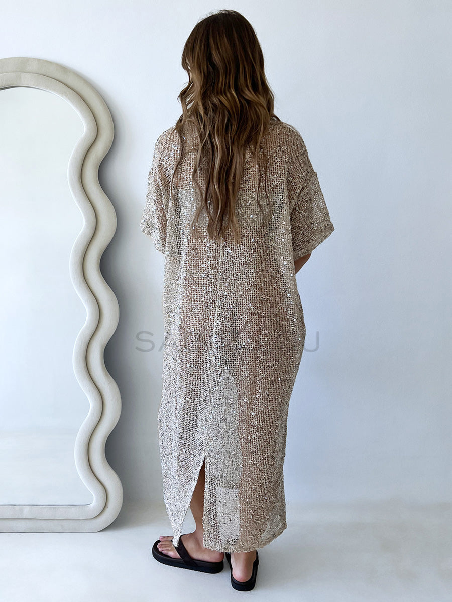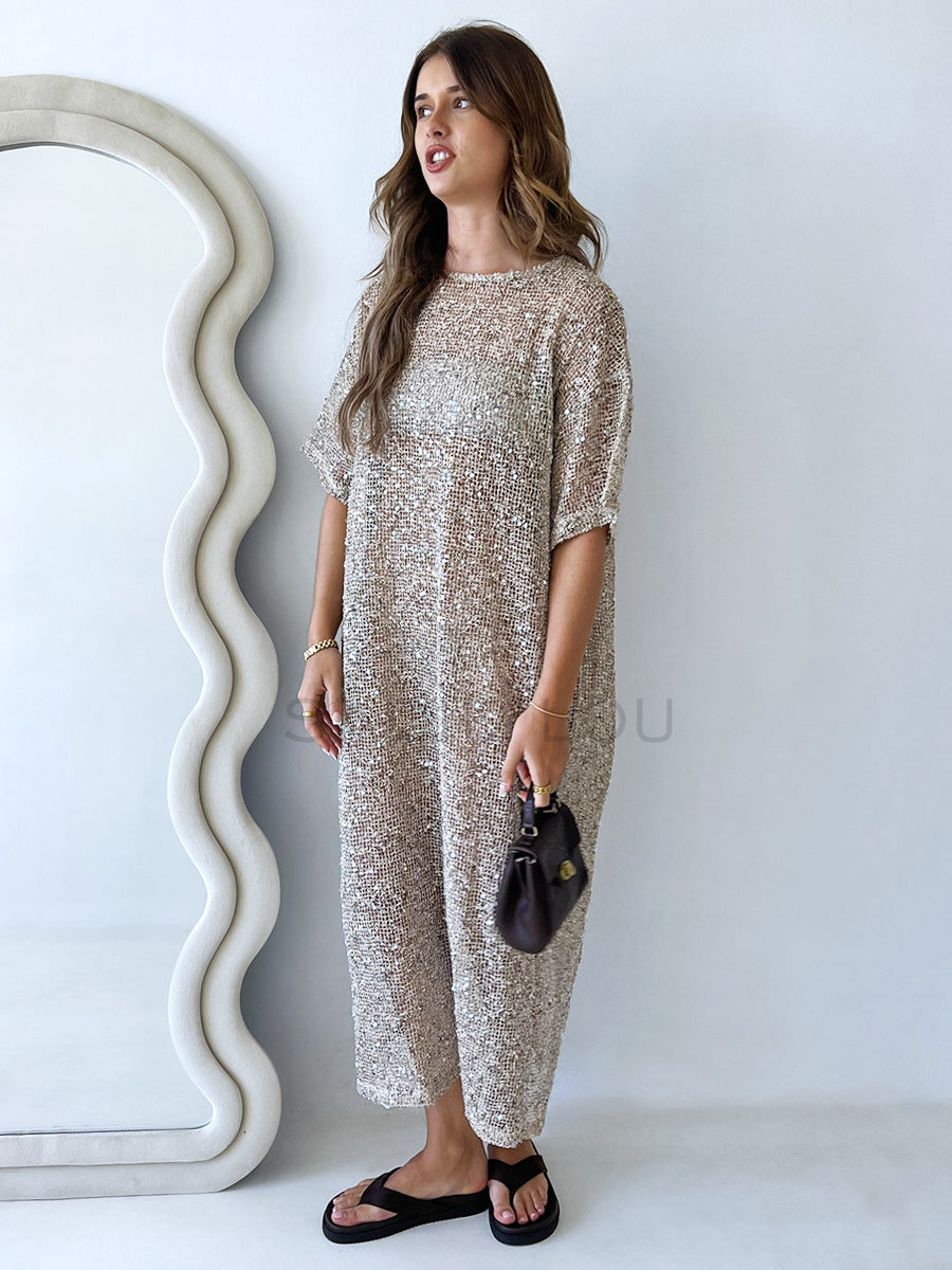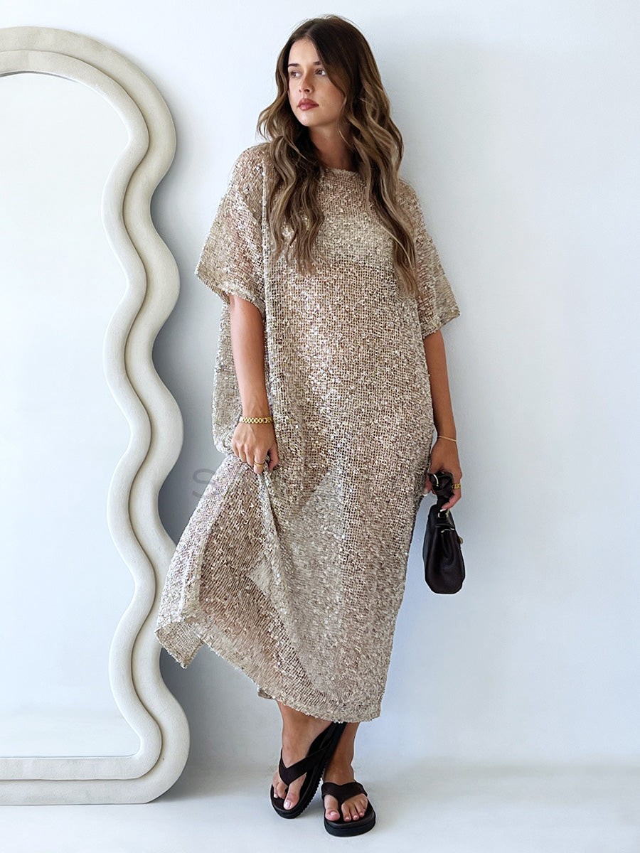 Designed to flatter, this piece is styled on a 170 cm model wearing a size Small, where the length elegantly skims the ankles for a dramatic yet wearable finish. The soft tee-shirt neckline and relaxed bodice balance the dazzling sequin embellishments, making this dress perfect for events where you want to stand out — from evening celebrations and fashion parties to summer soirees under the stars.