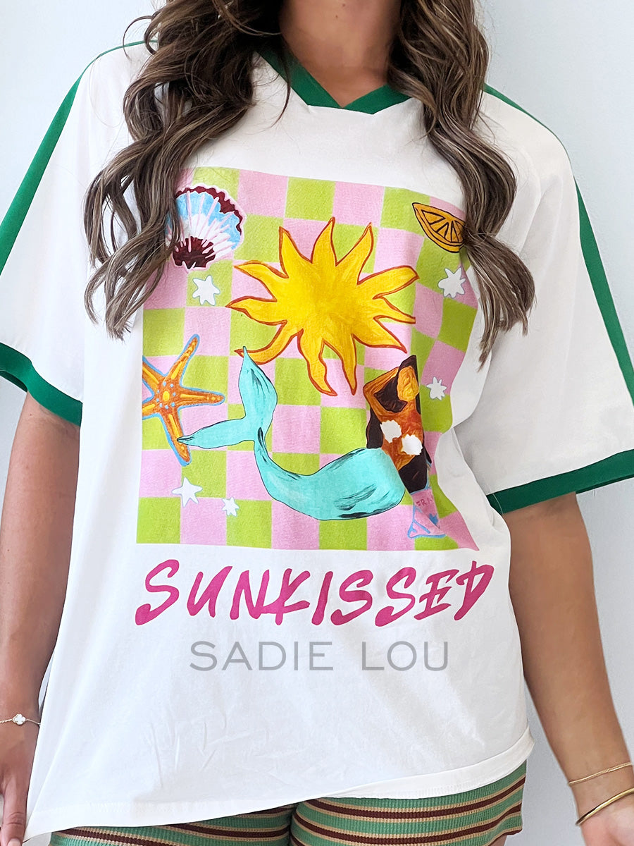 Bring sunshine to your everyday look with this playful white tee. Designed with a fresh green high V-neck trim and matching green racer stripes along the sleeves, this tee stands out with sporty-meets-fun detail. The front graphic features a whimsical mermaid basking in the sun, surrounded by stars and shells, with the word “Sunkissed” printed below in soft pink for a dreamy finishing touch.
