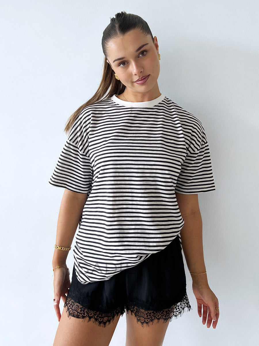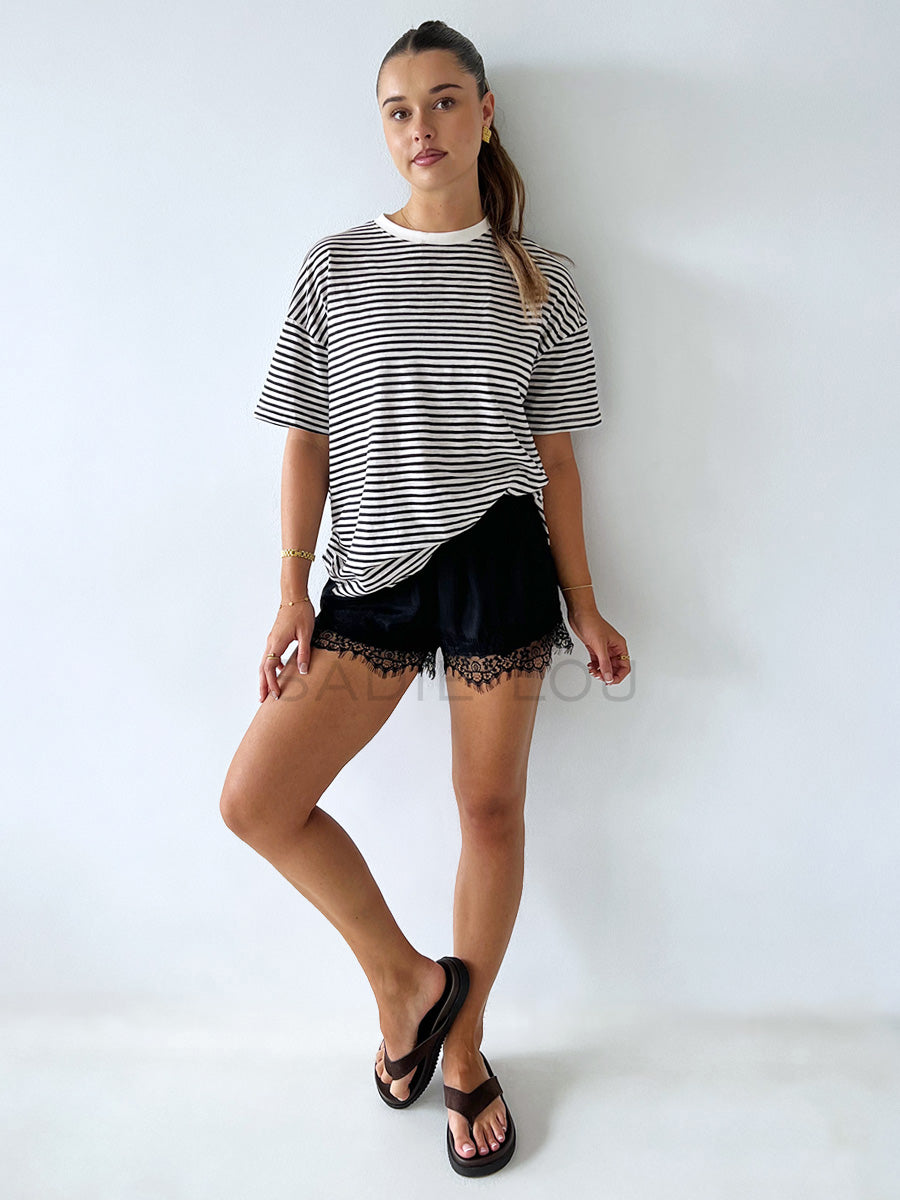 Featuring an elastic waistband and two functional side pockets, they’re as practical as they are chic. The hem is finished with 2 inches of delicate lace, adding a subtle feminine touch that elevates the silhouette.